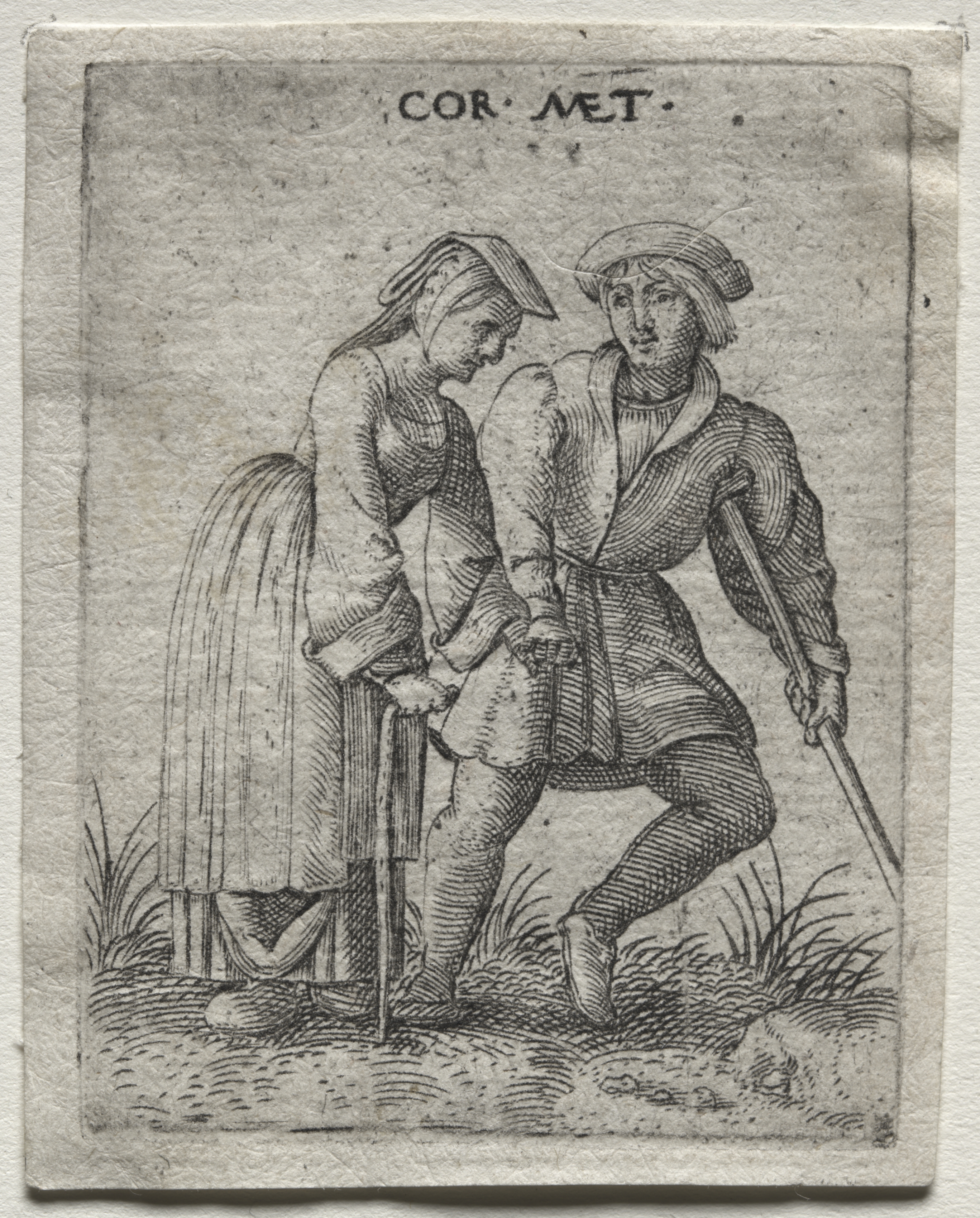 Black and white image of two people. A man and woman both wearing hats, the man on the right has one leg bent and holds a long thin object, likely a crutch. The woman beside him also holds what appears to be a crutch. They appear to be outdoors with tufts of grass around their feet. The man on the right seems to be leaning on the woman slightly. The background behind them is blank. The image is titled "Dancing Cripples" by Cornelis Massys.