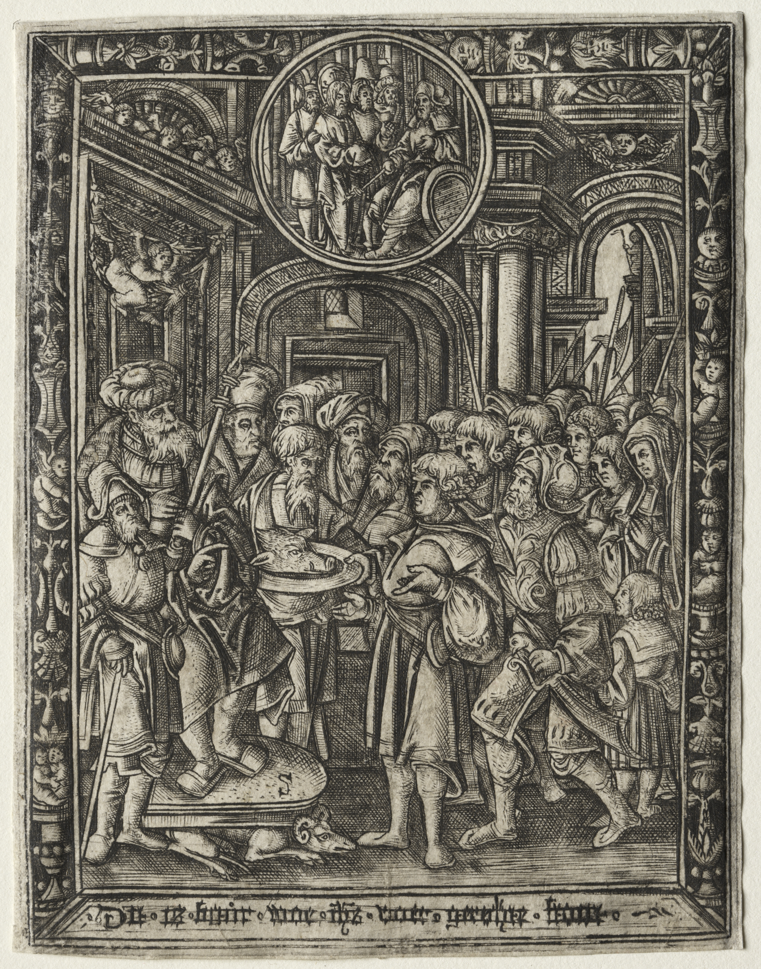 The Old King on His Throne by Albrecht Dürer: Black and white image of a crowd of men in historical clothing surrounding a man on a throne-like chair. The man on the throne holds a bowl and has a large hat on. He sits on a rug beside a small dog. Some men carry large objects. An oval frame at the top center contains more people. Intricate designs and text are on the border. The scene appears to be indoors with archways. The image is detailed and in a woodcut style.