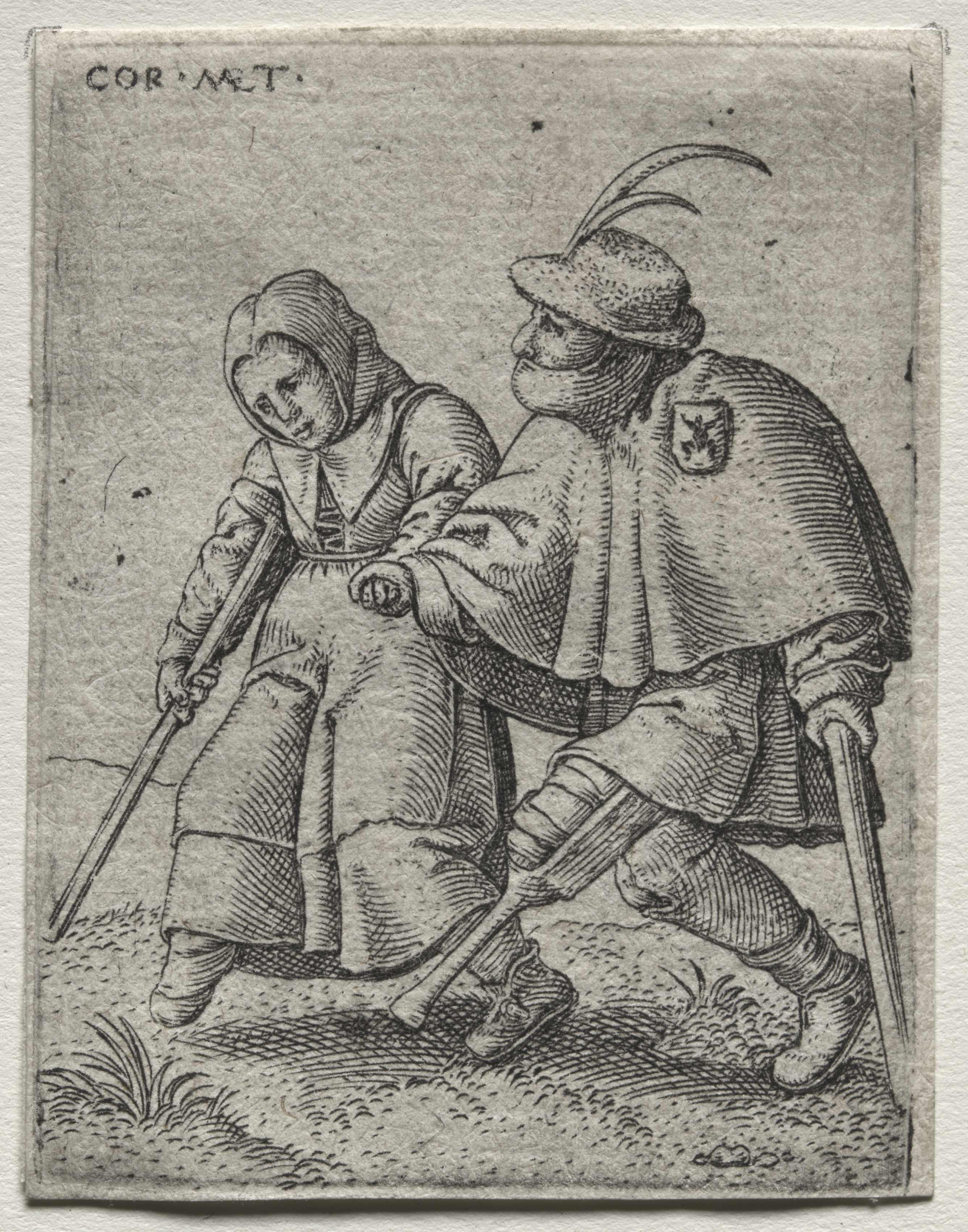 Black and white drawing of two people. The person on the left is a woman wearing a head covering, a long dress and shoes. She has a cane in her right hand. The woman has her left arm around the man on her right. The man is wearing a hat with a long feather in it. He has one crutch under his right arm and another in his left hand. His right leg is a wooden prosthetic. There is grass in the foreground. The background is blank. The image is titled "Dancing Cripples" by Cornelis Massys.