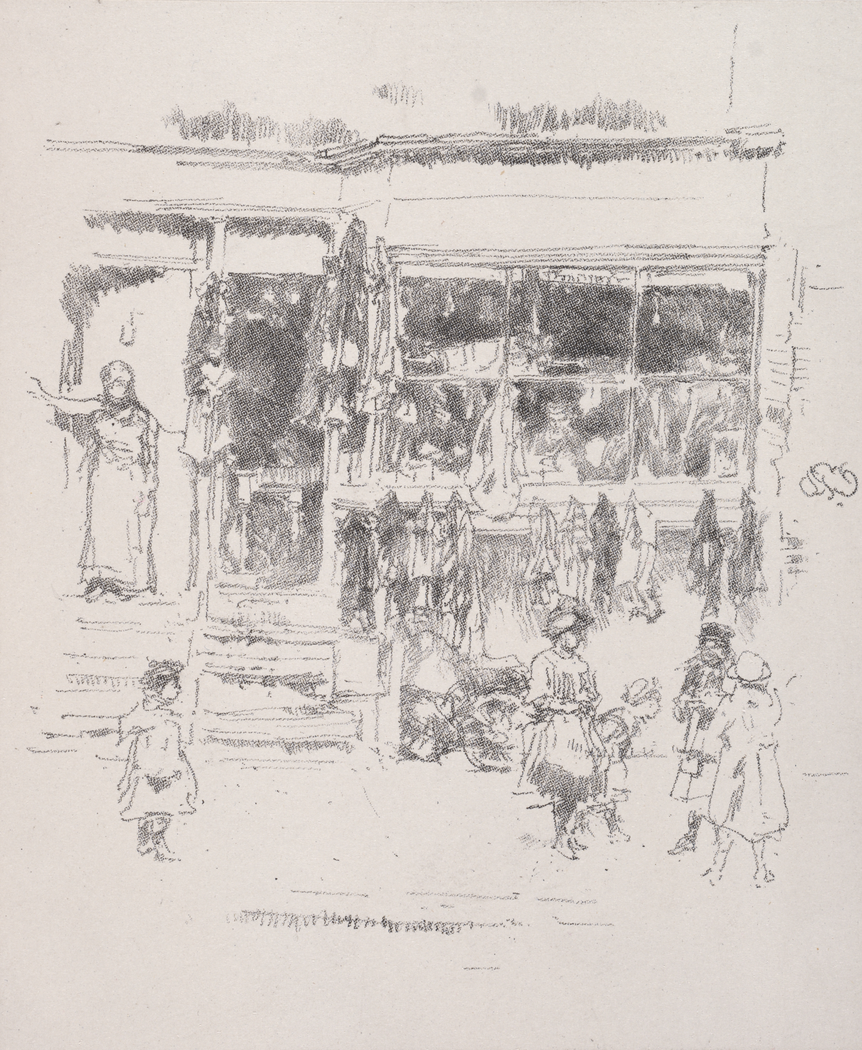 The image depicts a black and white sketch of a street scene. A building with a flat roof and a storefront with large windows is in the background. The storefront has a display window on the right and a doorway on the left. A woman stands on the steps leading to the doorway. Several people are on the sidewalk in front of the building. A woman and child are on the right, and a child stands alone on the left. The people are dressed in clothing typical of the late 19th or early 20th century. The title "Chelsea Rags" and the artist "James McNeill Whistler" are associated with the image.