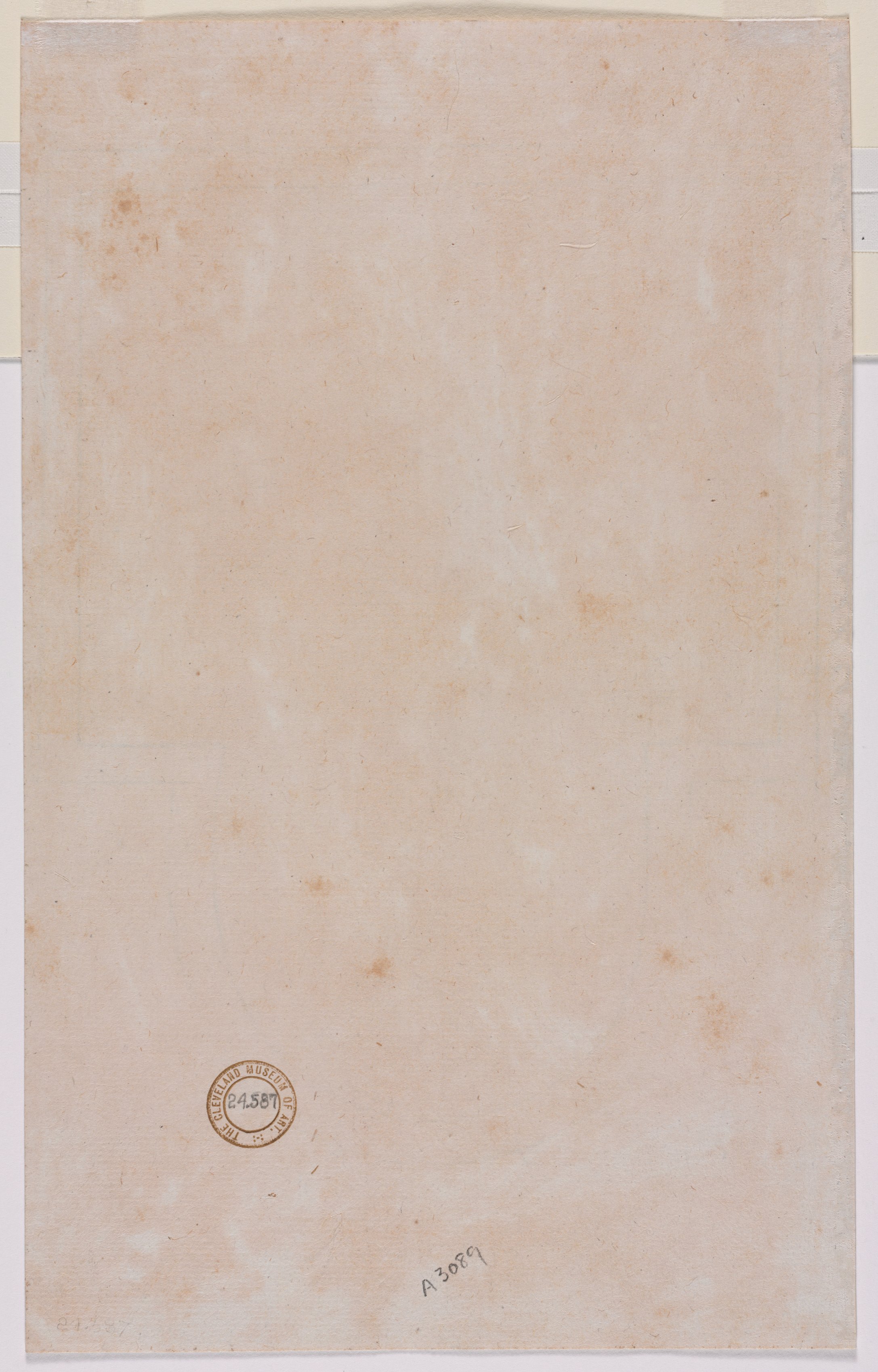 Light brown paper with darker brown spots. Circular stamp on bottom left. Handwritten numbers on bottom right.