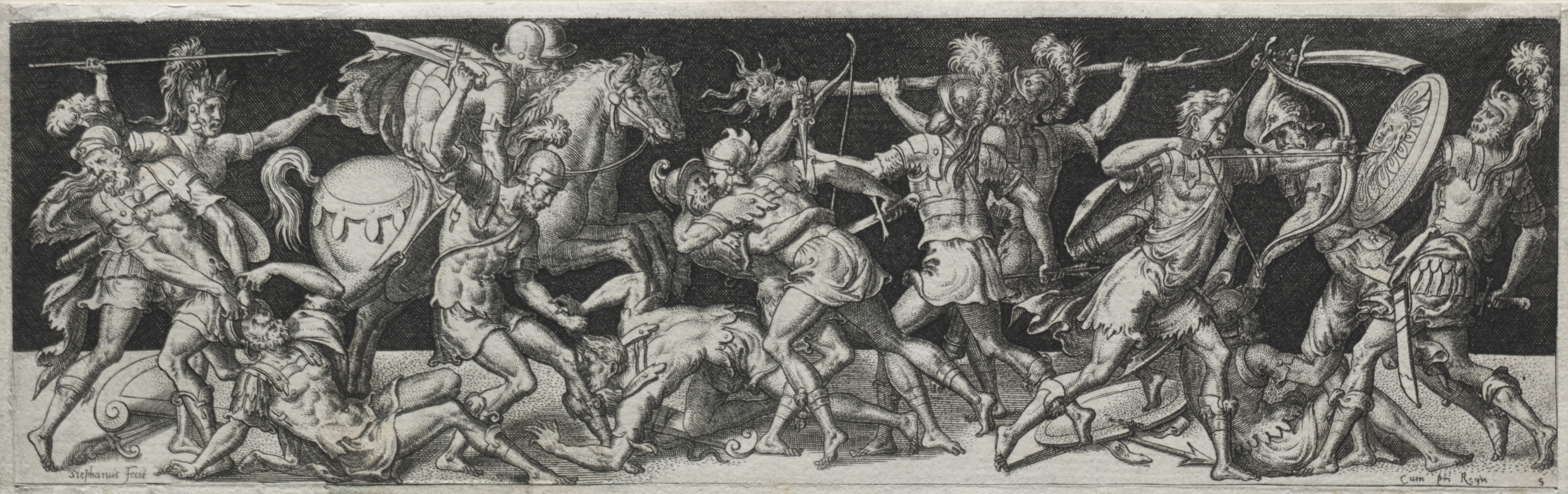 Black and white image. A chaotic battle scene with multiple figures. One man on horseback wears a helmet. A man on the left holds a shield. A man on the right holds a shield and sword. Several men are lying on the ground. Some figures wear helmets with feathers. A man with a spear is riding a horse. The background is dark. Title: Combats and Triumphs. Artist: Etienne Delaune.