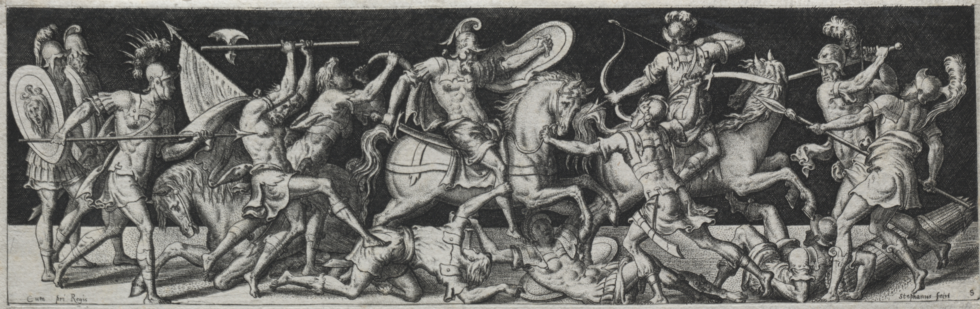 Black and white image of a chaotic battle scene. A group of men on foot and on horseback are engaged in combat. Some men are wearing helmets and holding shields, swords, and spears. Several men are lying on the ground. The men on horseback are wearing loincloths and holding weapons. One man on the left is holding a flag. The background is dark. The title is "Combats and Triumphs" and the artist is Etienne Delaune.