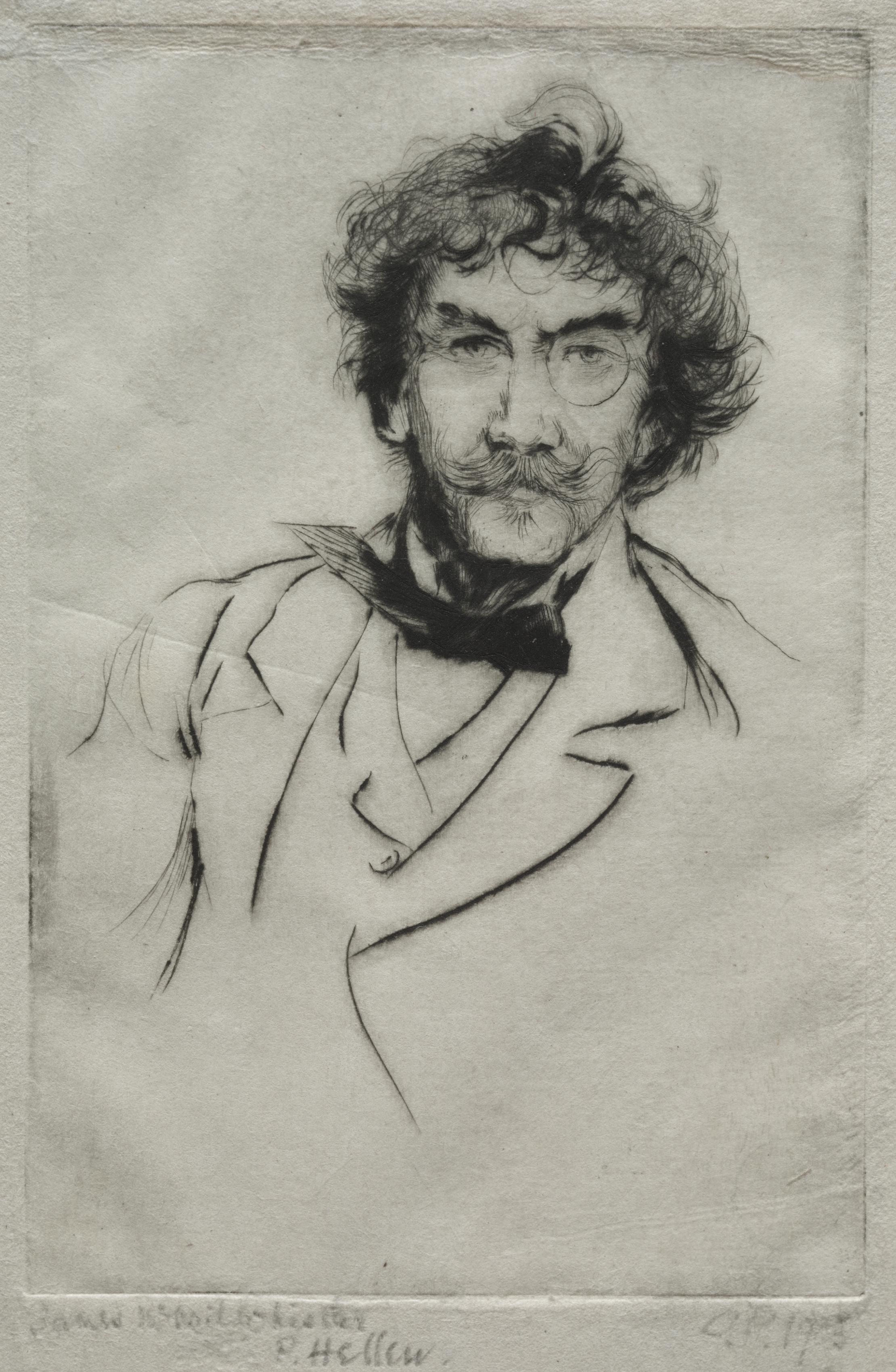 Black and white portrait drawing of a man with curly hair and a mustache. The man has a handlebar mustache and goatee. He wears round glasses, a black bowtie, and a light-colored suit jacket. His head and shoulders are visible. The drawing is on textured paper with a rough, aged appearance. The background is light gray. A signature appears at the bottom. The image depicts James MacNeill Whistler, created by Paul César Helleu.