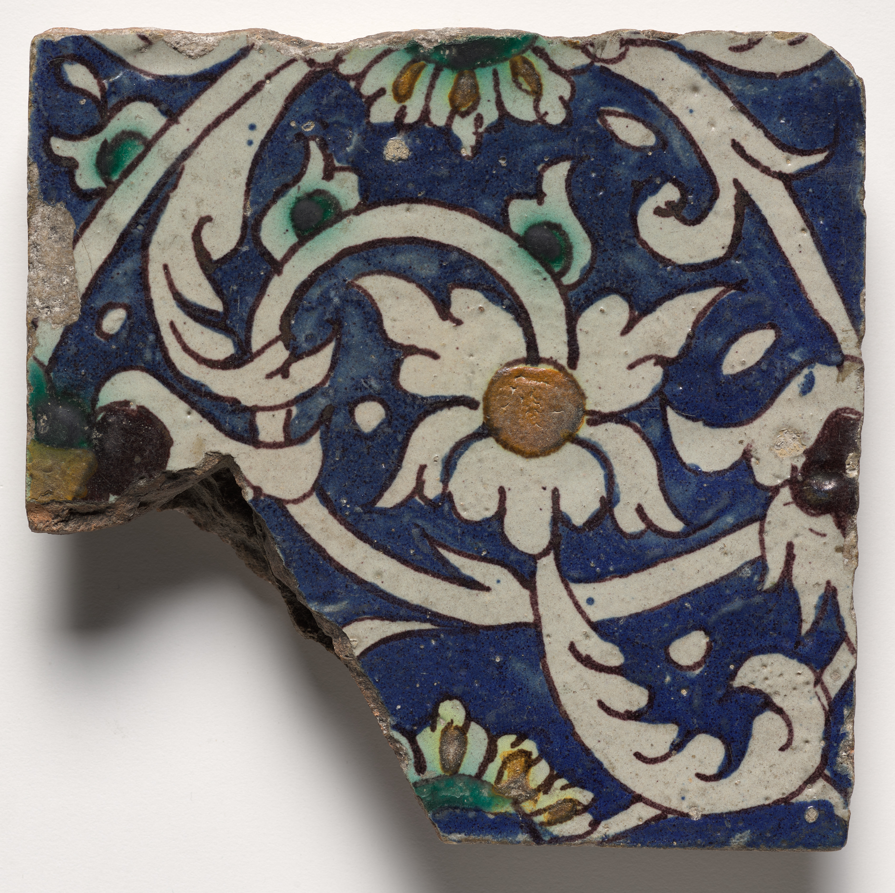 Blue and white tile with a floral pattern with gold accents. The tile depicts a blue background with white floral patterns. The floral designs consist of curving lines that form a flower with multiple petals. Gold accents are present in the center of flowers and on parts of the design. Green accents are also present. The tile is broken, with jagged edges visible on the left and bottom. The background behind the tile is white. The tile is titled "Foliated Scrolls" by an unknown artist.
