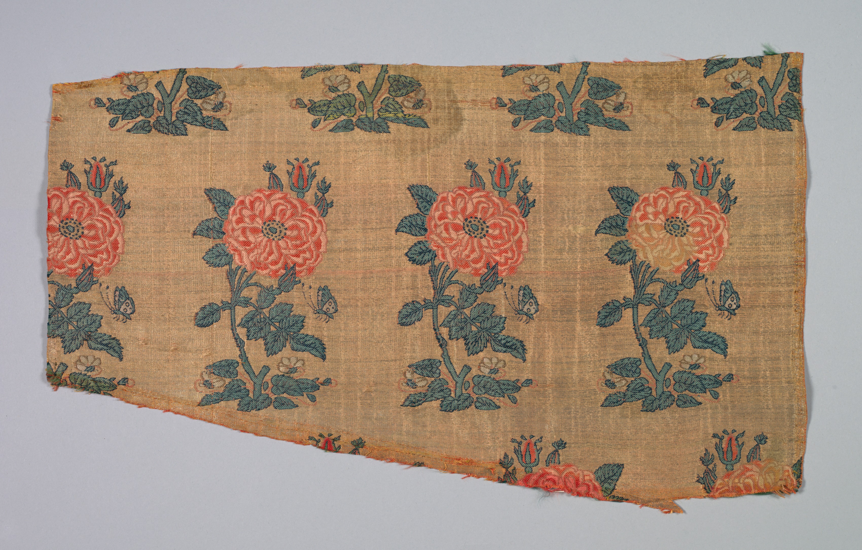 Tan-colored fabric with a repeating pattern of pink roses and green leaves. The fabric is rectangular but has uneven edges, with the bottom edge being slightly curved upwards. The fabric appears to be made of a woven material, possibly cotton or linen. The pattern features large pink roses with many petals and green leaves and stems. The roses are arranged in a repeating design, with each rose facing outwards. Green butterflies are scattered among the roses. The background of the fabric is a light tan color. The fabric is set against a plain gray background.