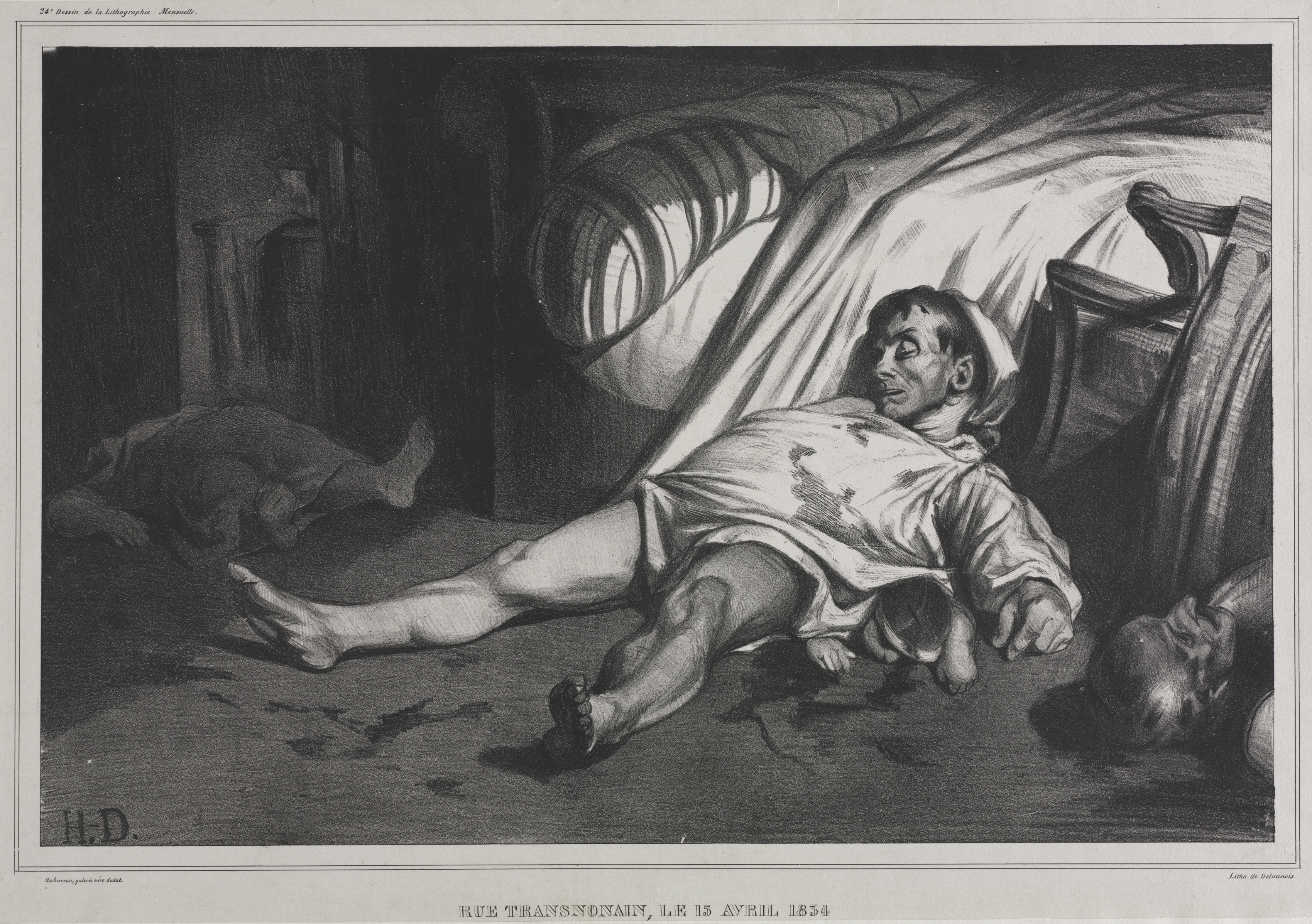 Black and white drawing of a man lying on the floor. The man is wearing a white shirt and underwear. His right leg is stretched out, while his left leg is bent at the knee. He is positioned on his side with his head resting on a surface, possibly a bed. A small child lies in front of him on the floor. Another person lies on the floor to the left. A bed with rumpled sheets looms over him on the right. Dark smudges are on the floor near the man. The background appears to be a dark room. The text at the bottom reads "RUE TRANSNONAIN, LE 15 AVRIL 1834."
