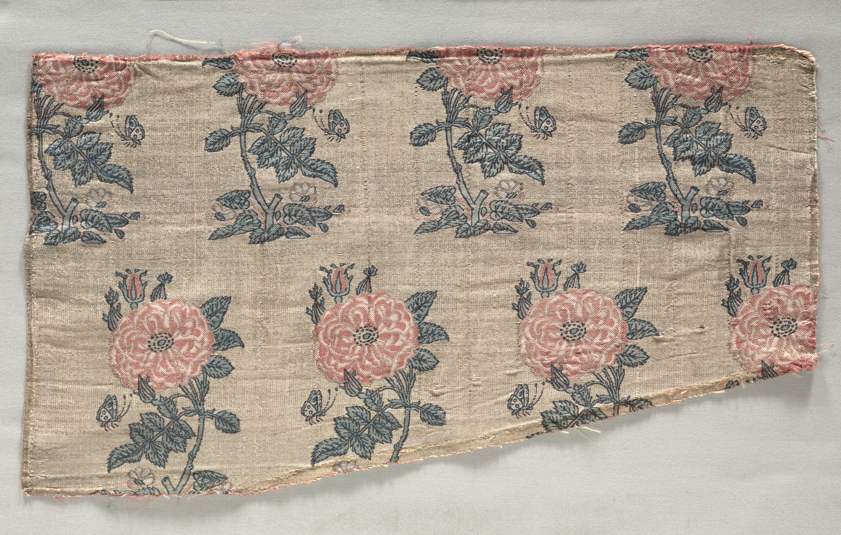 Fragment by an unknown artist shows a piece of fabric with a floral pattern. The fabric is rectangular with a jagged edge at the bottom right corner. The background of the fabric is beige. The fabric features a repeating pattern of pink flowers with white details and blue leaves and stems. Small blue butterflies are scattered throughout the design. The edges of the fabric are frayed and worn. The fabric is set against a light gray background.