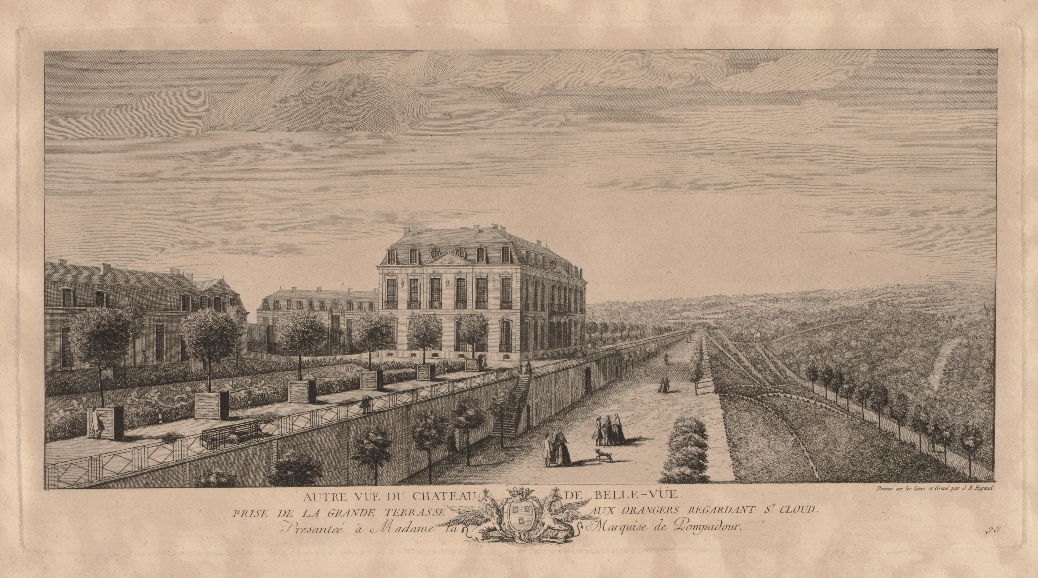 Black and white drawing of a large building, Chateau Bellevue, surrounded by a garden, trees, and low stone walls. A paved walkway leads to the chateau, with people walking on it. The chateau has multiple stories, a mansard roof, and columns. Hills are visible in the background. The sky is cloudy. Text at the bottom includes the title "Chateau Bellevue" and artist "Jacques Rigaud".
