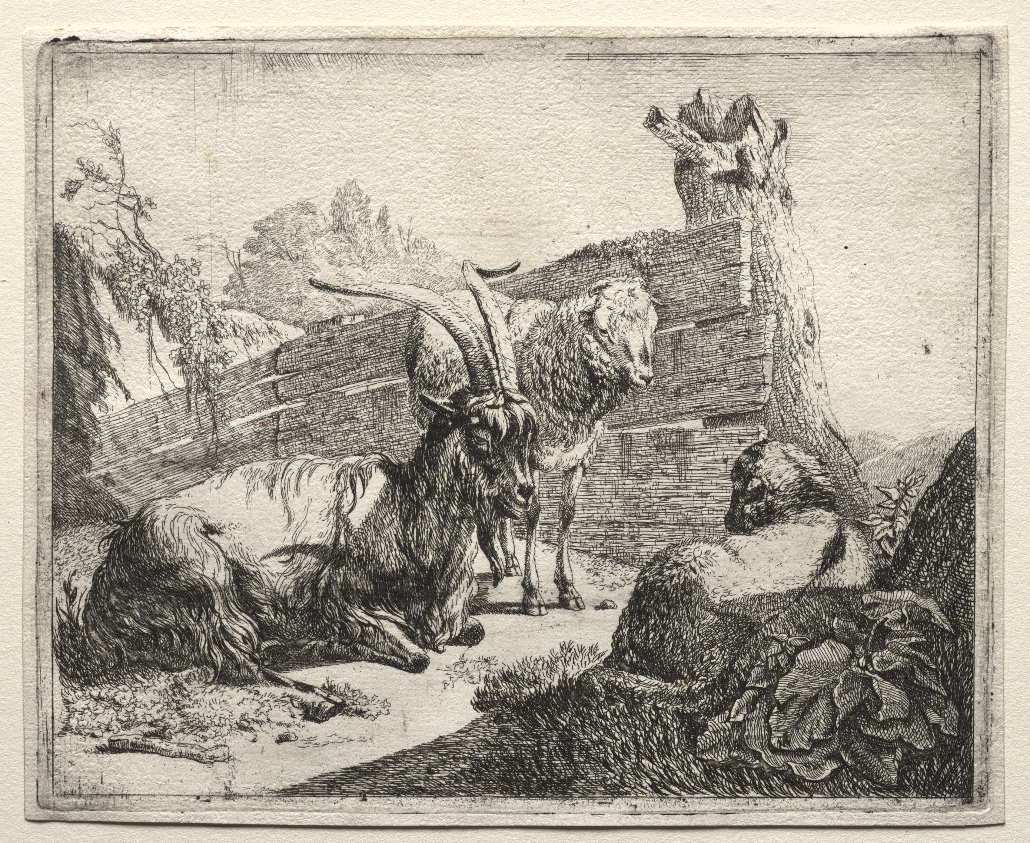 The Hedgerow by Johann Heinrich Roos. Black and white etching on textured paper. A group of three goats are in a fenced area. One goat lies on the ground on the left. The goat to its right stands. The third goat crouches on the right. The goats have long fur and curved horns. The background shows a wooden fence with a tree stump beside it and additional trees on the left. The image is framed by a thin dark line. The artwork depicts a simple landscape.