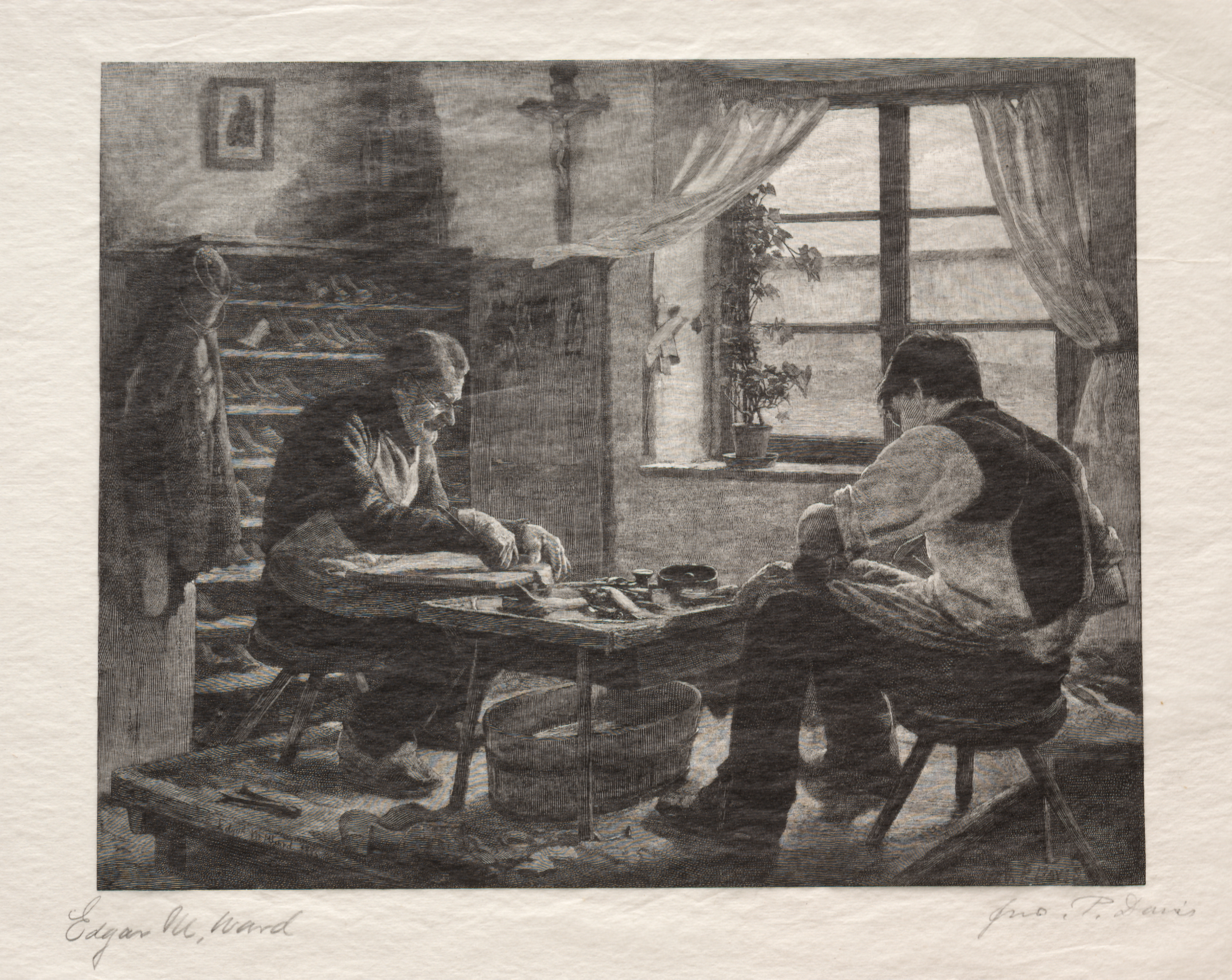 The Cobblers by John Parker Davis: A grayscale image of two men in a room. The man on the left sits at a table with his feet on a footstool, working on a shoe. He wears a hat, a collared shirt, a vest, and pants. The man on the right sits on a stool with his back to the viewer, wearing a cap, a collared shirt, a vest, and pants. A window with curtains and a plant on the sill is on the right. A fireplace with shelves and a picture on the wall is on the left. The room has a table with tools on it.