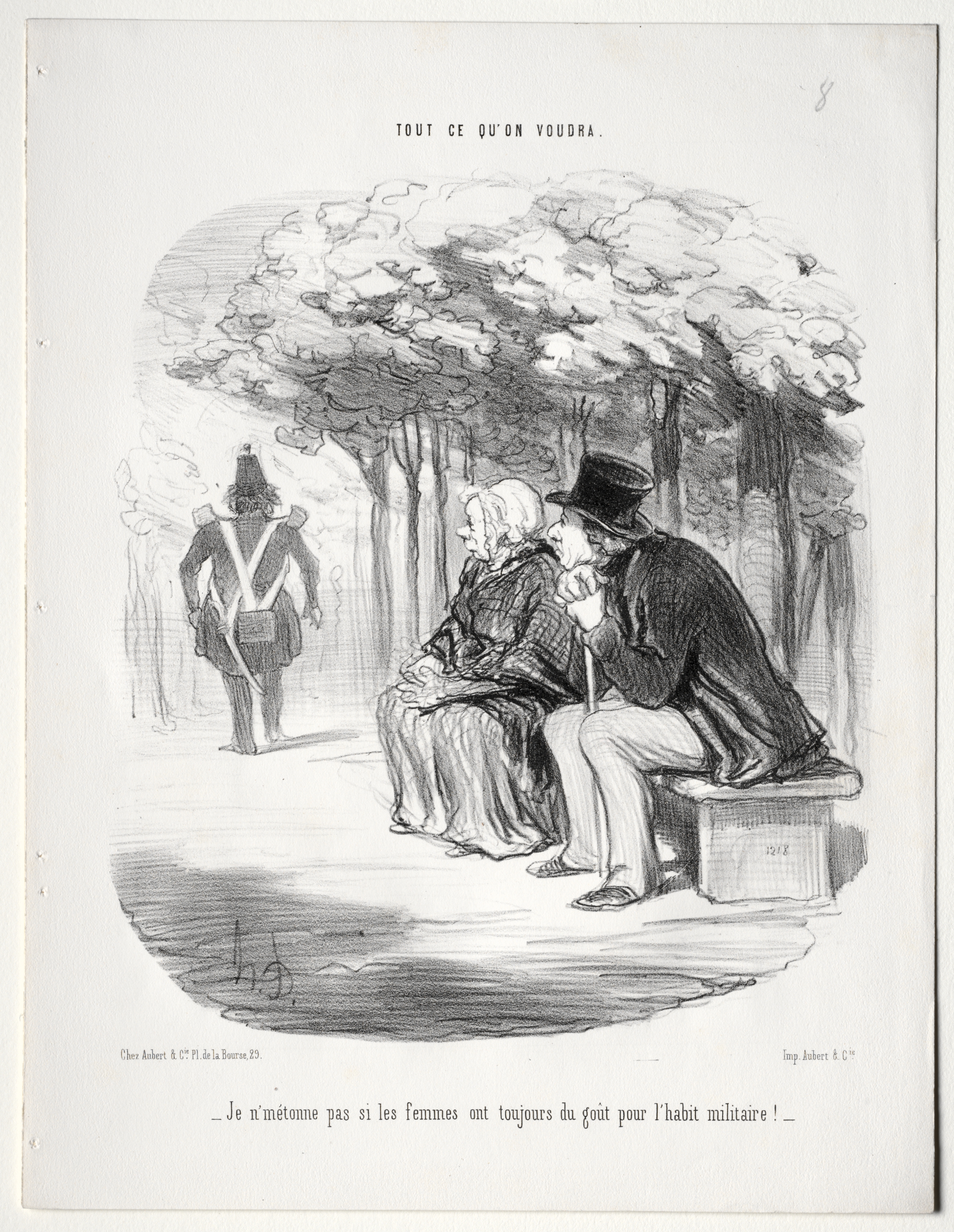 Black and white drawing of a seated couple on a bench. The man on the right wears a dark top hat, jacket, and light-colored pants. The woman on the left wears a dress with a shawl and has light-colored hair. A military figure in uniform walks away from them in the background. They sit under trees. Text appears at the top and bottom of the image.