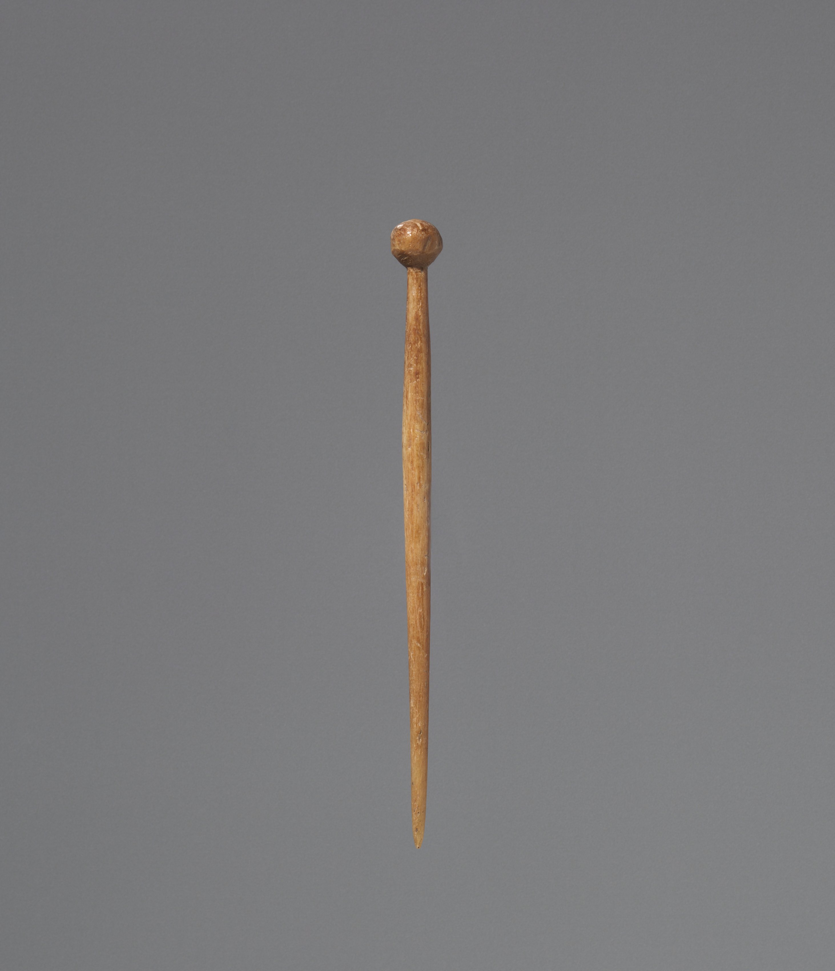 The image shows a hairpin titled "Hairpin" by an unknown artist. The hairpin is made of wood and has a long, thin shaft with a rounded end. The shaft is straight and tapers to a point at the bottom. The top of the hairpin has a small, rounded knob. The background of the image is a solid gray color.