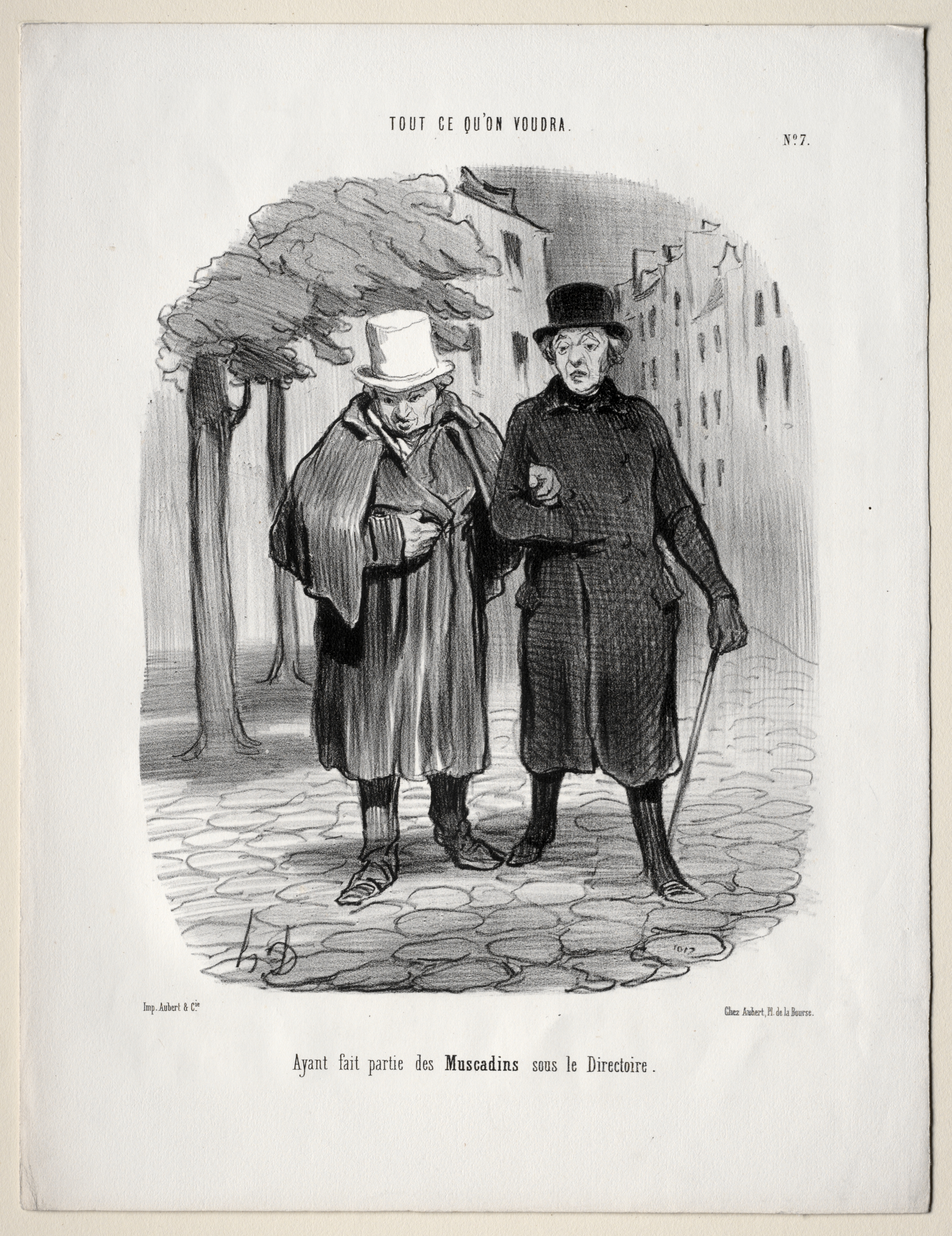 Black and white illustration of two men on a cobblestone street. The man on the left wears a long coat with a shawl or cape over it, and a tall white hat. He looks down. The man on the right wears a dark top hat, a dark coat and holds a cane. He looks to the side. Behind them, there are buildings and a tree. Text at the top reads "TOUT CE QU'ON VOUDRA" and "N°7". Text at the bottom reads "Ayant fait partie des Muscadins sous le Directoire".