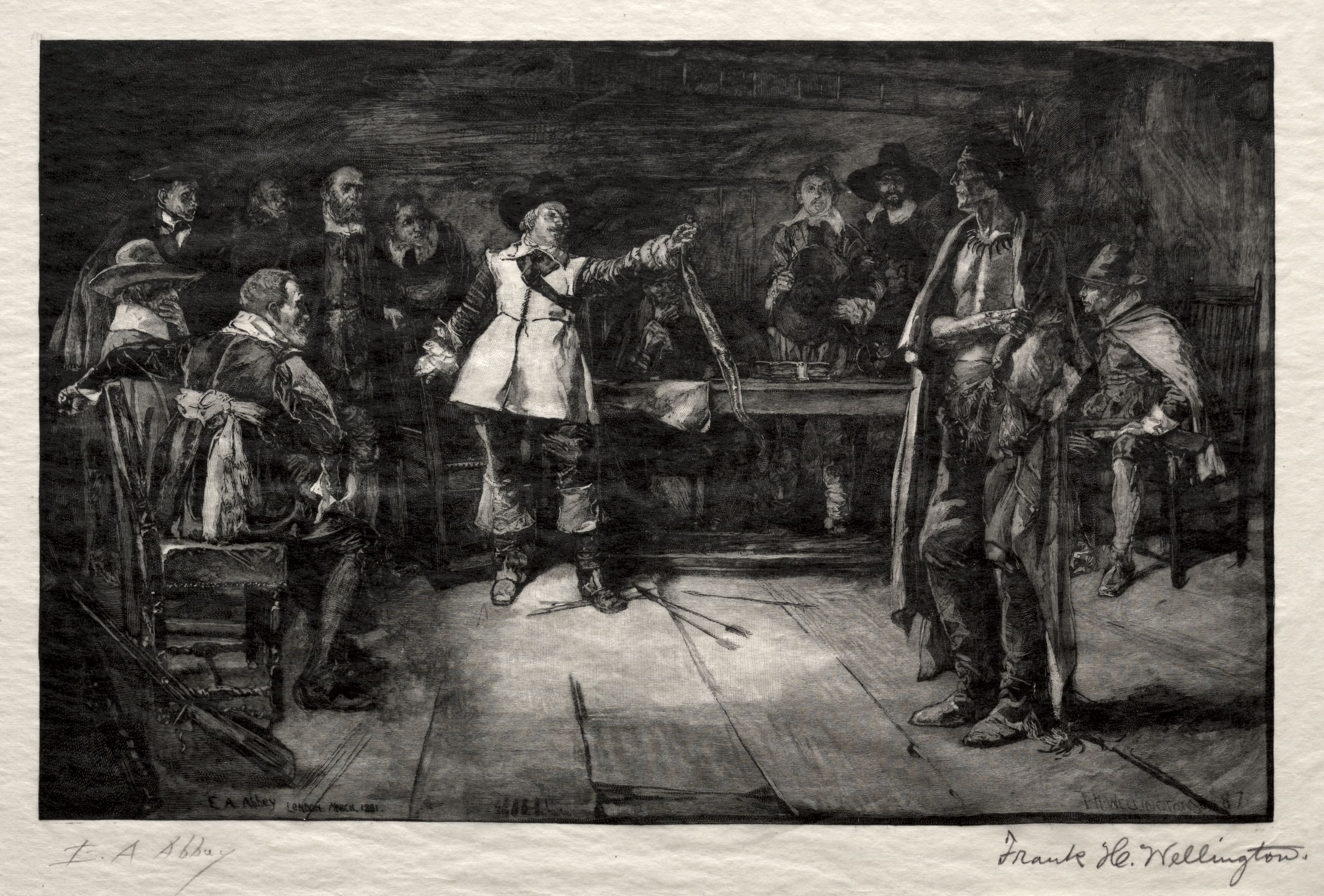 Black and white image. A group of men in old fashioned clothing. The man on the center left sits on a chair. The man on the center right stands with a long weapon. The man in the center stands with one arm outstretched and holds a string. There are other men in the background. The scene takes place indoors. The artist and title are Miles Standish's Challenge by Frank H. Wellington.