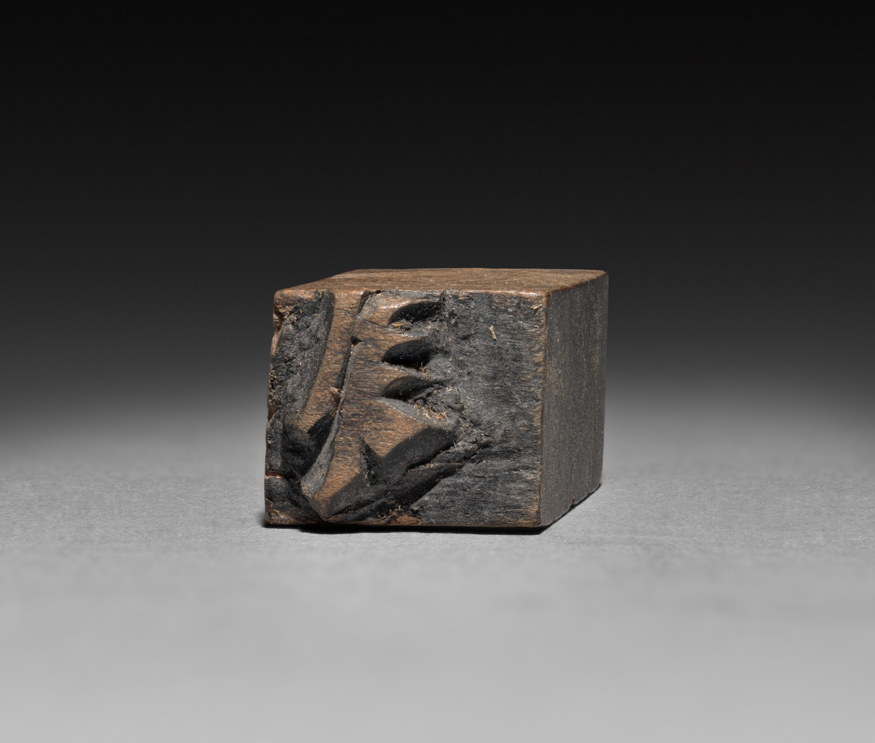 Wooden Moveable Type by artist. A small, rectangular block made of wood. The block is oriented vertically, with its longest sides facing left and right. The top surface of the block is flat and smooth. The front face of the block features raised, carved characters. The block has a dark brown color with visible wood grain. The background is dark at the top and lightens towards the bottom, with the block casting a subtle shadow.
