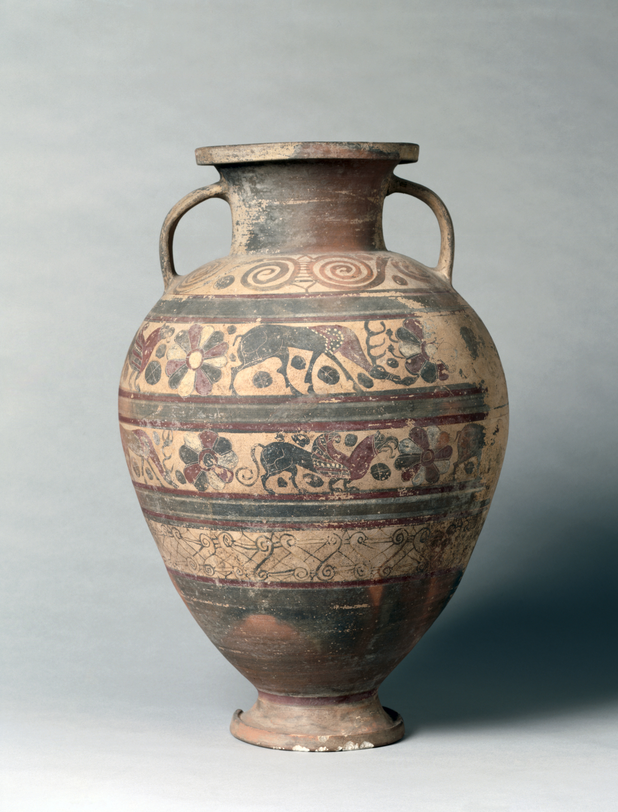 The object is an ancient, large, ceramic vessel with a wide body and narrow neck. The vessel has two handles on either side of the neck. It features a wide base that tapers to the top. The body of the vessel is decorated with various designs and patterns, including horizontal bands, spirals, flowers, animals, and geometric shapes. The colors used are primarily shades of brown, black, and red. The overall shape of the vessel is symmetrical, with a rounded body and a small foot at the base. It appears to be an amphora, which was commonly used for storing liquids.