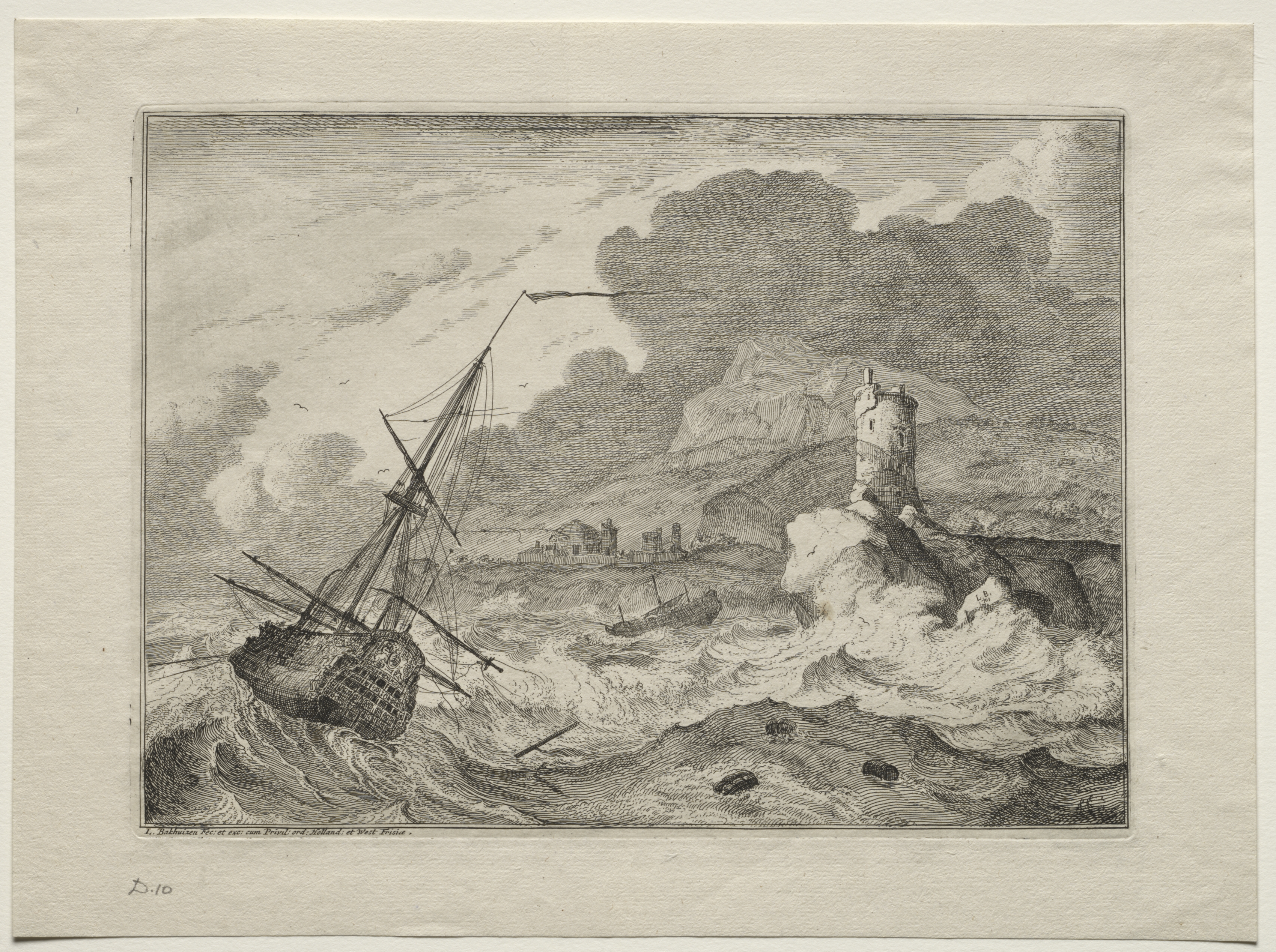 Stormy sea with dark clouds; ship on the left struggling in the waves, rigging tangled; waves crashing on rocks on right; a lighthouse on top of rocks on right; buildings on the far shore; white border around image. Storm at Sea by Ludolf Backhuysen.