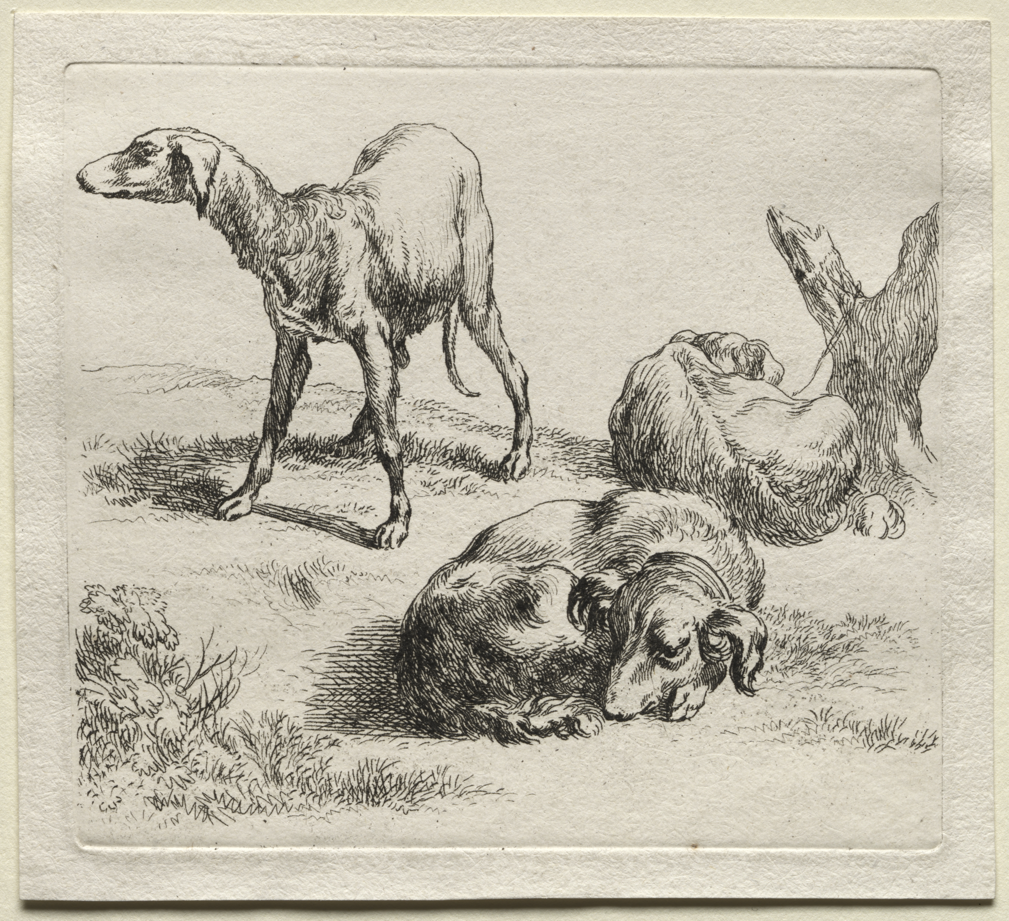 The image depicts three dogs, titled "Three Hunting Dogs" by Nicolaes Berchem. The standing dog on the left has a long snout, floppy ears and medium-length fur. The dog lying down in the foreground has a shorter snout, medium fur, and a curled tail. The third dog, on the right, lies on its side with its head pointing up and one leg raised. The background features grass, bushes, and a tree stump. The image is a black-and-white drawing with detailed shading. The composition is rectangular with a textured border around the drawing. The overall scene depicts the dogs in a natural setting.
