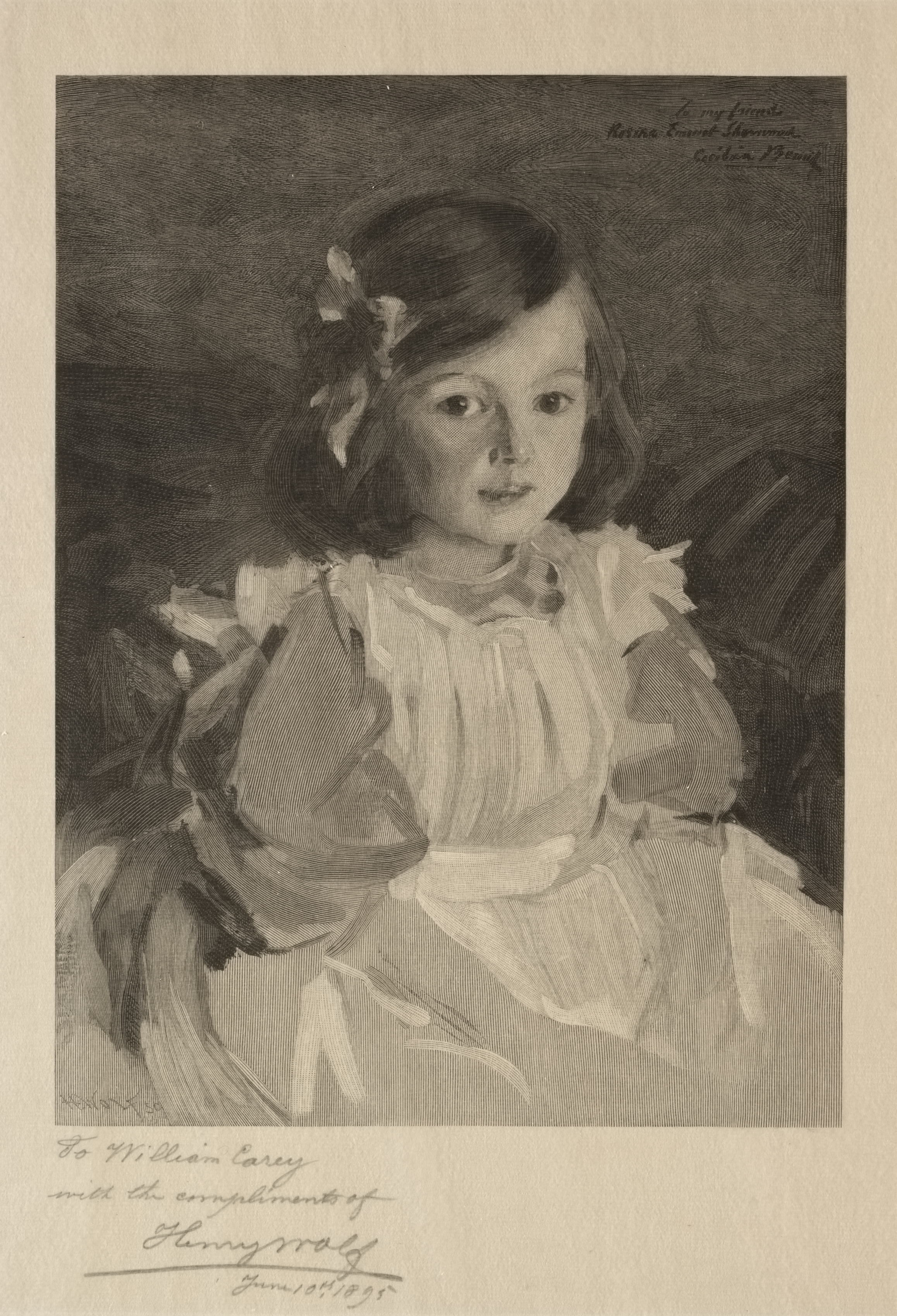 Black and white portrait of a young girl, facing forward and slightly to the right. She has dark hair parted in the middle with a light-colored flower tucked behind her ear. Her hair falls in waves to her shoulders. She wears a dress with a high neckline and puffy short sleeves. A wide white ribbon encircles her waist. The background is dark and shadowy. A dedication is written in cursive at the bottom. The title of the piece is Cynthia and the artist is Henry Wolf.