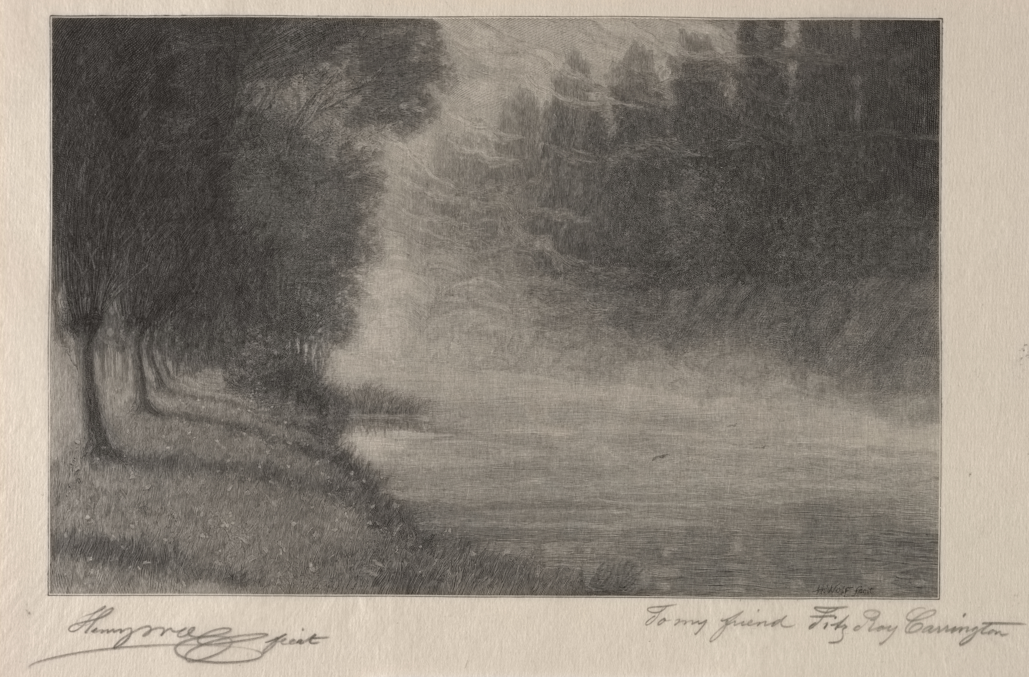 The image "Morning Mists" by Henry Wolf depicts a serene landscape. The scene shows a body of water, likely a lake or river, with a grassy shoreline on the left side. Several trees line the left side of the image, some of which are reflected in the water. The atmosphere is misty, with fog rising from the water's surface. The dominant colors are shades of gray, with darker tones used for the trees and lighter tones for the misty areas. The artwork is signed by the artist in the bottom-left corner and includes a dedication to a friend in the bottom-right corner. The image is set against a beige background, which appears to be the paper on which the artwork is printed. The overall mood of the image is peaceful and contemplative.