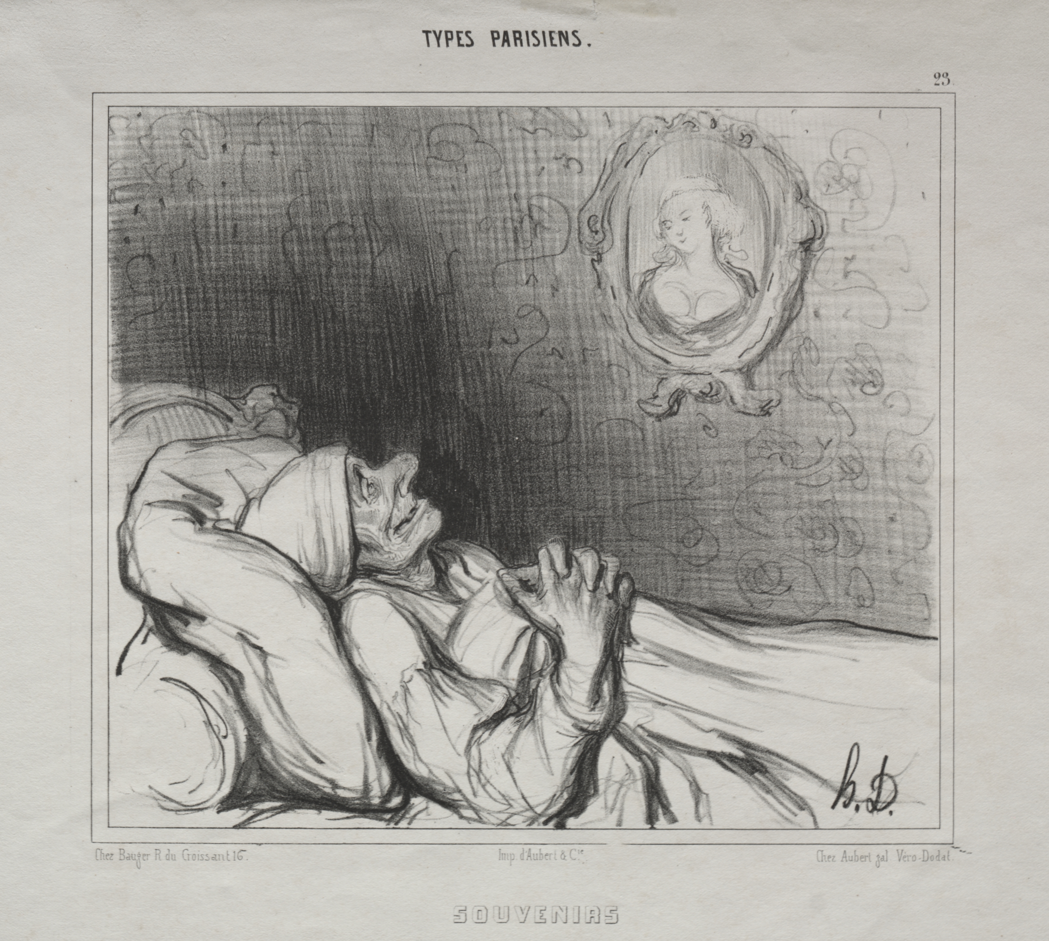 Black and white sketch of a man lying on a bed, propping his head up with the arm on the left. His other arm is straight up with the palm facing outwards. He wears a loose long-sleeved shirt or robe. A pillow curves behind him on the left. A frame on the wall to the right contains a woman with long hair. The wall has a pattern. The image is in a rectangle and sits on a white background. Text at the top reads "TYPES PARISIENS." and at the bottom reads "SOUVENIRS". The artist's signature is in the bottom right corner of the rectangle.