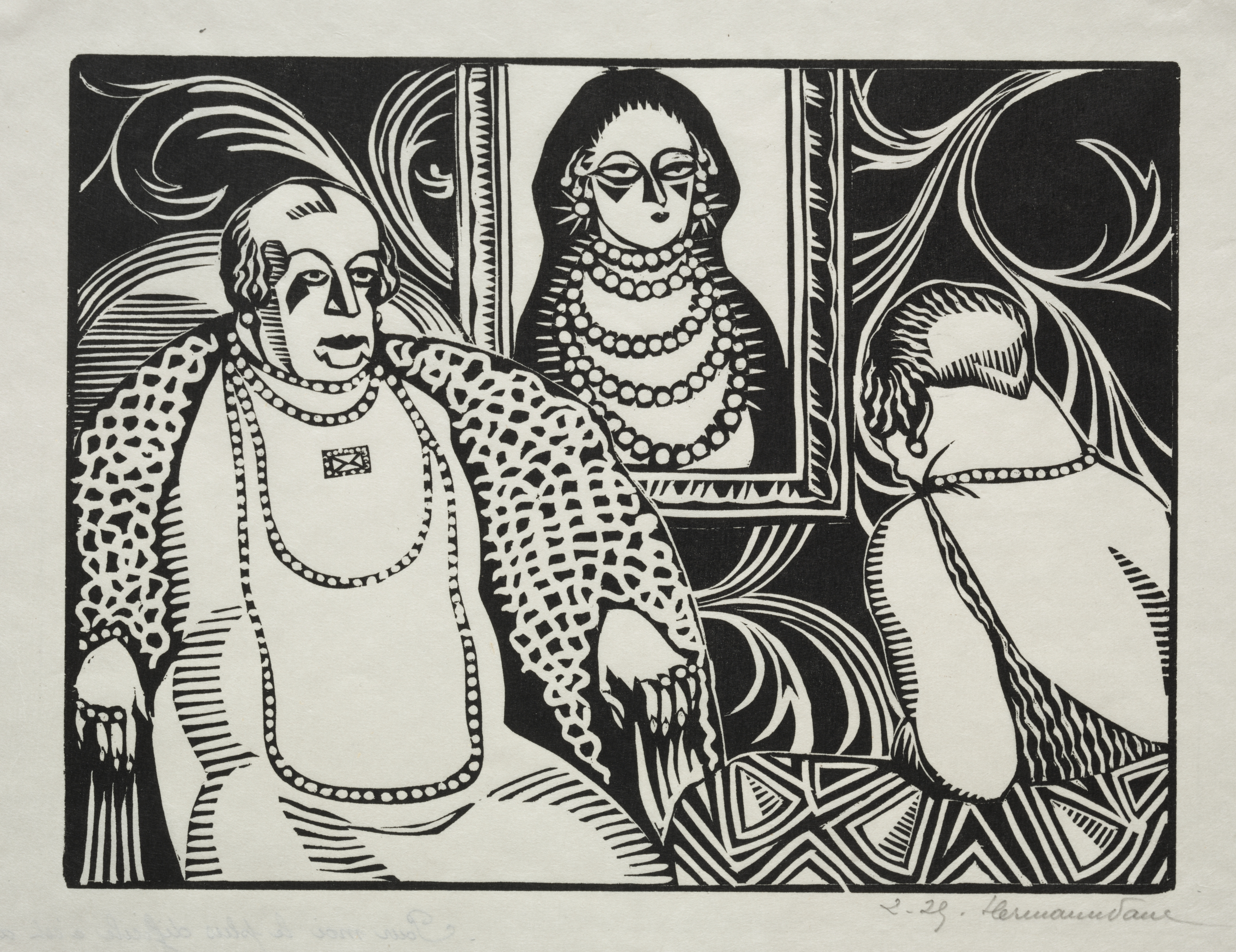 Black and white woodcut print. Two people and a framed portrait. Person on left sitting with short hair, leopard print shawl, multiple necklaces, and a brooch. Person on right with their head down and hair pulled back. The portrait shows a woman with dark hair, multiple necklaces, and dark eye makeup. Curved lines in background behind portrait. Geometric patterns on clothing and rug.