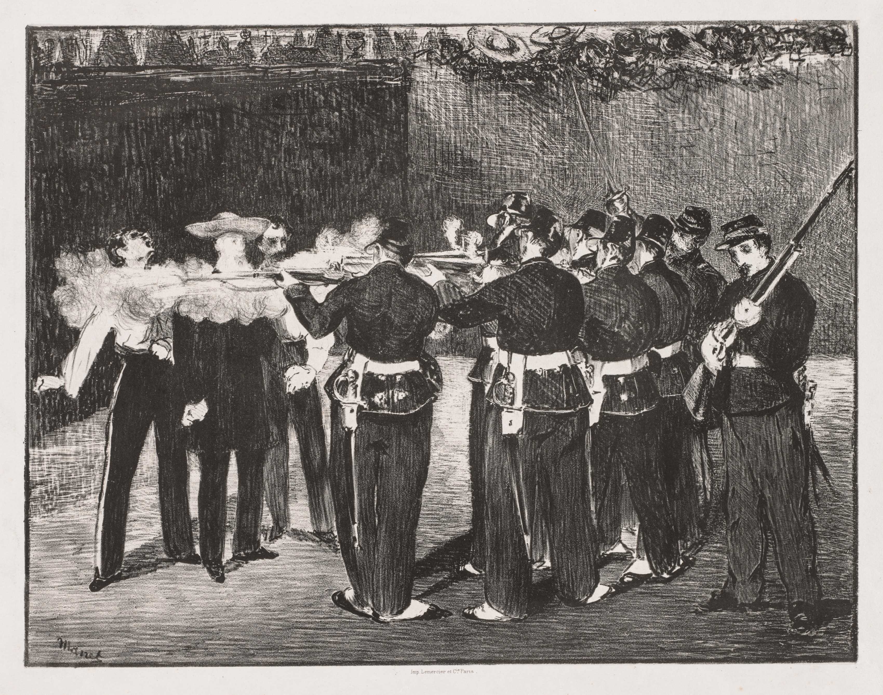 The Execution of Emperor Maximilian by Edouard Manet: A black-and-white drawing of a group of men in military uniforms standing in a line, facing a man in a dark suit and a woman and a man beside him, the man wearing a large hat, white shirt with large frills, and dark pants. Seven men in uniform stand to the right, one holding a long gun. The background has a wall with people. All are standing.