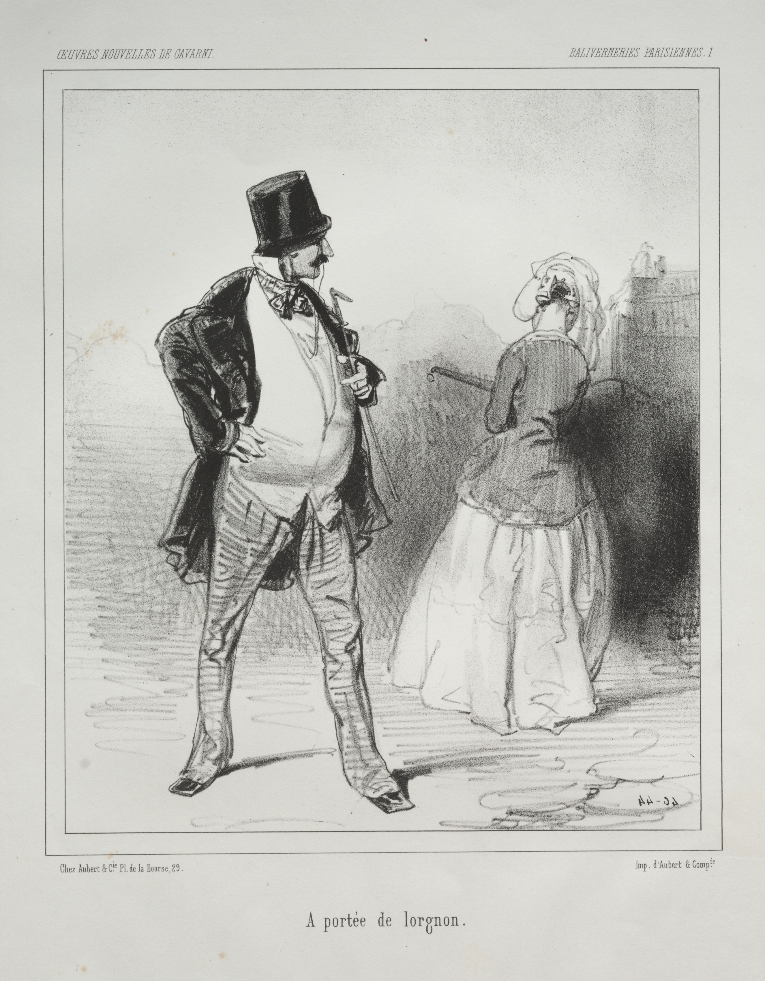 Black and white drawing of a man and a woman. The man wears a top hat, dark jacket over white vest and shirt, bow tie, pants tucked into boots. The man has one hand on hip and holds a cigar in the other. The woman wears a long white skirt and a dark jacket with a white head covering. She faces right and holds a lorgnon. In the background, there is a building on the right and smoke from the cigar on the left. Text at the bottom of the drawing reads "A portée de lorgnon."
