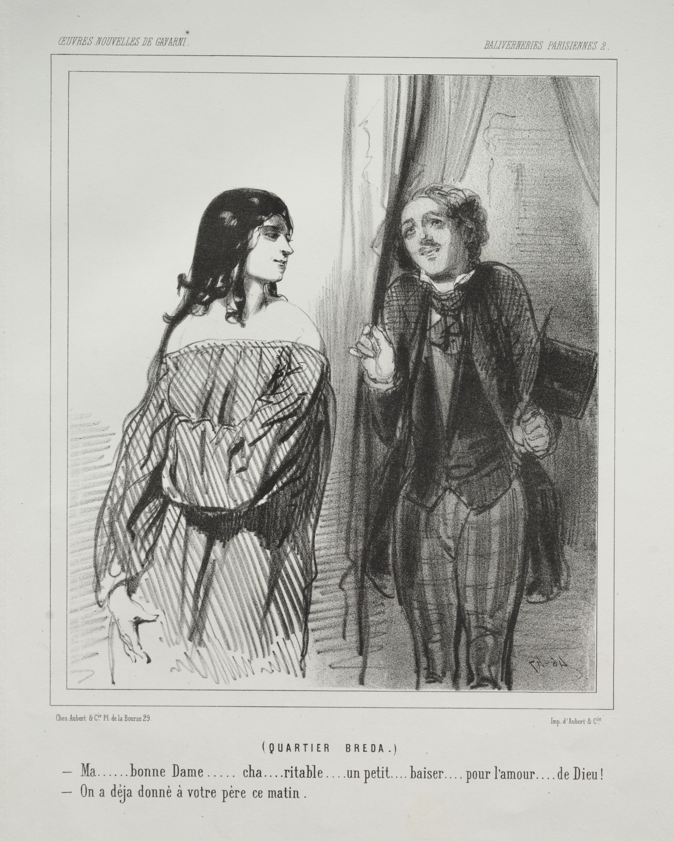 Black and white drawing of a man and woman. The woman is on the left, wearing a dress with sleeves that cover her arms but not her shoulders. Her hair is dark and reaches her shoulders. She faces right. The man on the right has light-colored hair and wears a plaid suit with a bowtie. He holds a hat in one hand and gestures with the other. He faces left, looking at the woman. The background includes a curtain on the right. Small text is printed below and above the drawing.