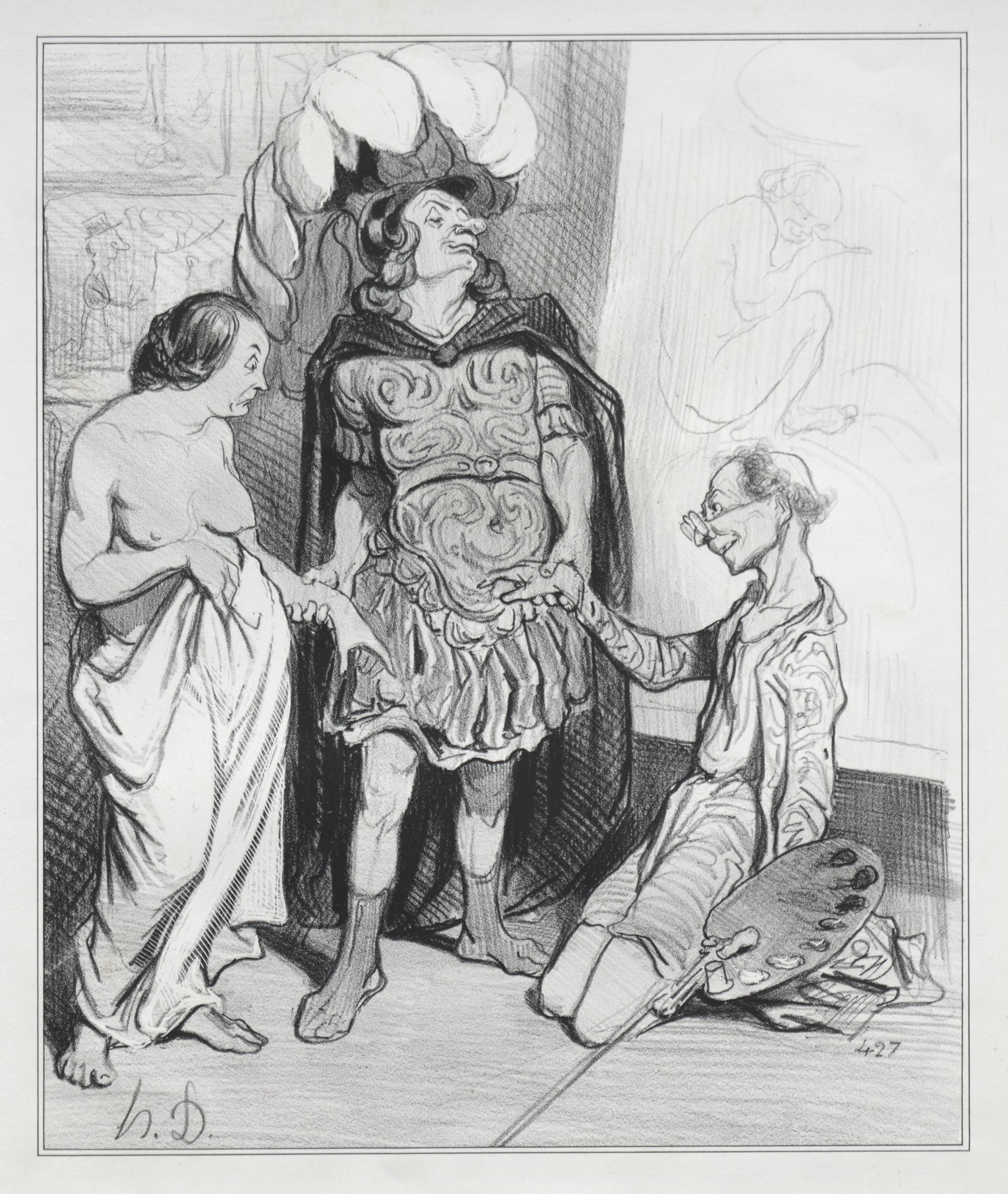 Black and white drawing of three people. A shirtless woman with a cloth wrapped around her lower body standing on the left. A man with a helmet and cape standing in the center, wearing armor on his chest and upper arm and a short skirt. A man on one knee on the right, holding a paint palette and brushes and touching the armor on the standing man's abdomen. The standing man looks up to the left at something unseen. The background is a wall with a shelf containing an indistinguishable object and a sketch of a man sitting.
