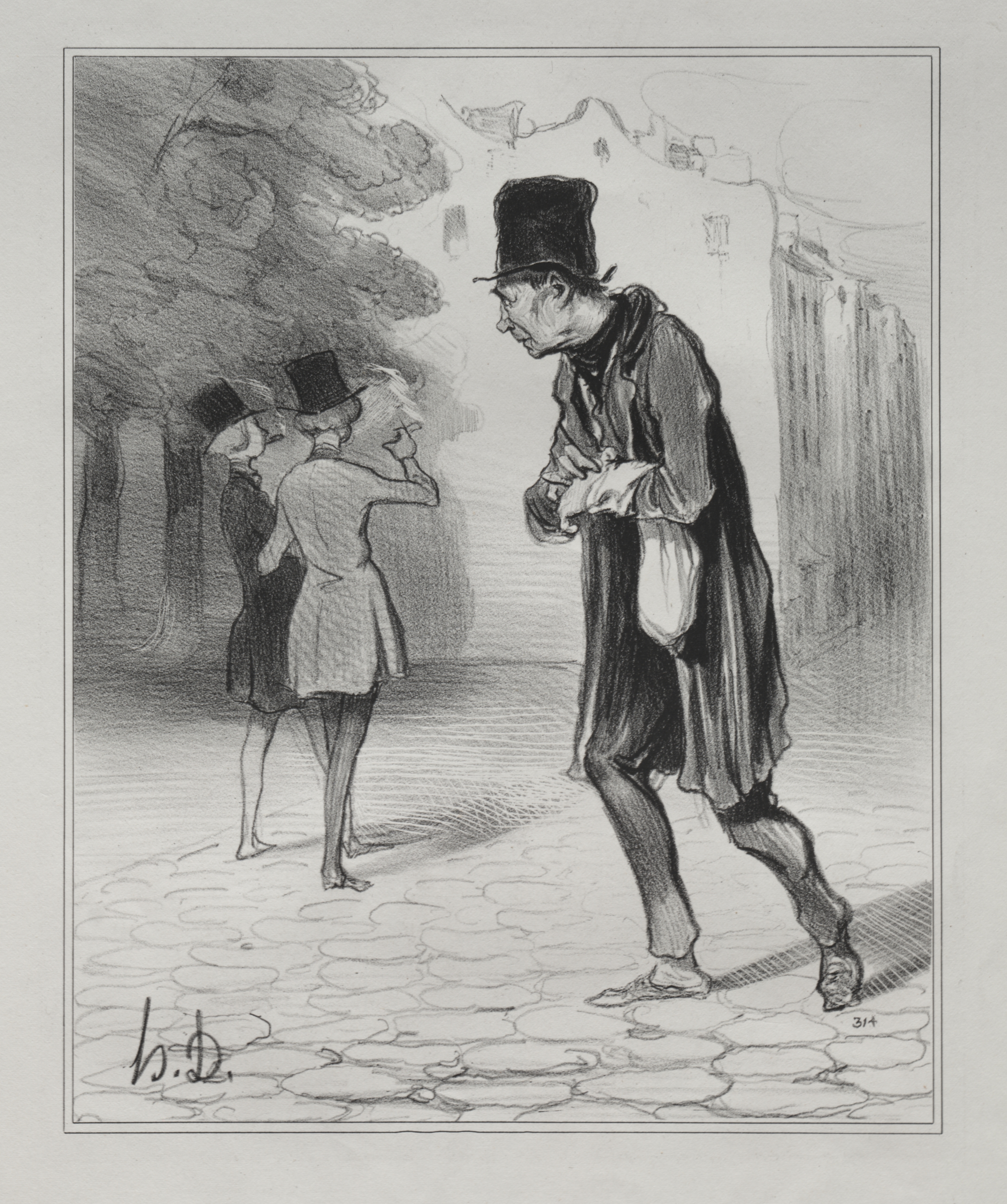 Black and white drawing of a man in a top hat and long coat bending down to pick up something on the ground. The man picking something up is standing on a cobblestone road and facing two other men who are also wearing top hats. The two men standing are talking to each other. The man bending down appears to be holding a cloth bag. There is a wall and a tree to the left and right of the standing men. The drawing is signed in the bottom left corner. The scene depicts a city street. The title of the drawing is "The Collector of Cigar Stubs" and it is by Honoré Daumier.