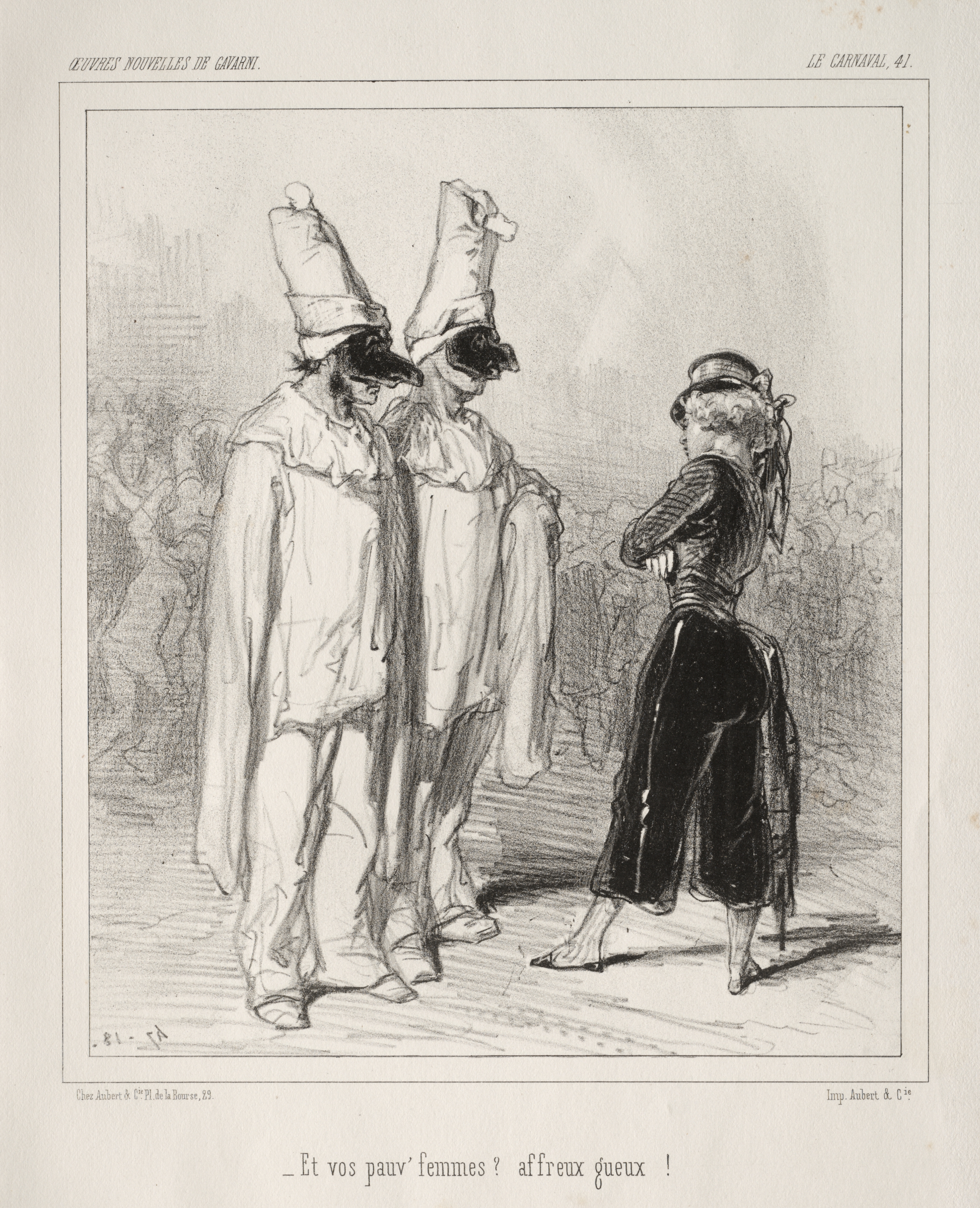 The image depicts a black and white drawing of three people. Two people are wearing white outfits and tall hats. The person on the left has their hat slanted to the left and the person on the right has their hat slanted to the right. They both have their heads bowed down. The third person is on the right, wearing a black outfit and a hat with feathers. They are standing with their arms crossed and looking at the two people in white. The background is a blurry depiction of people. There is text at the top and bottom of the image. The image is titled "Carnaval" and created by Paul Gavarni.