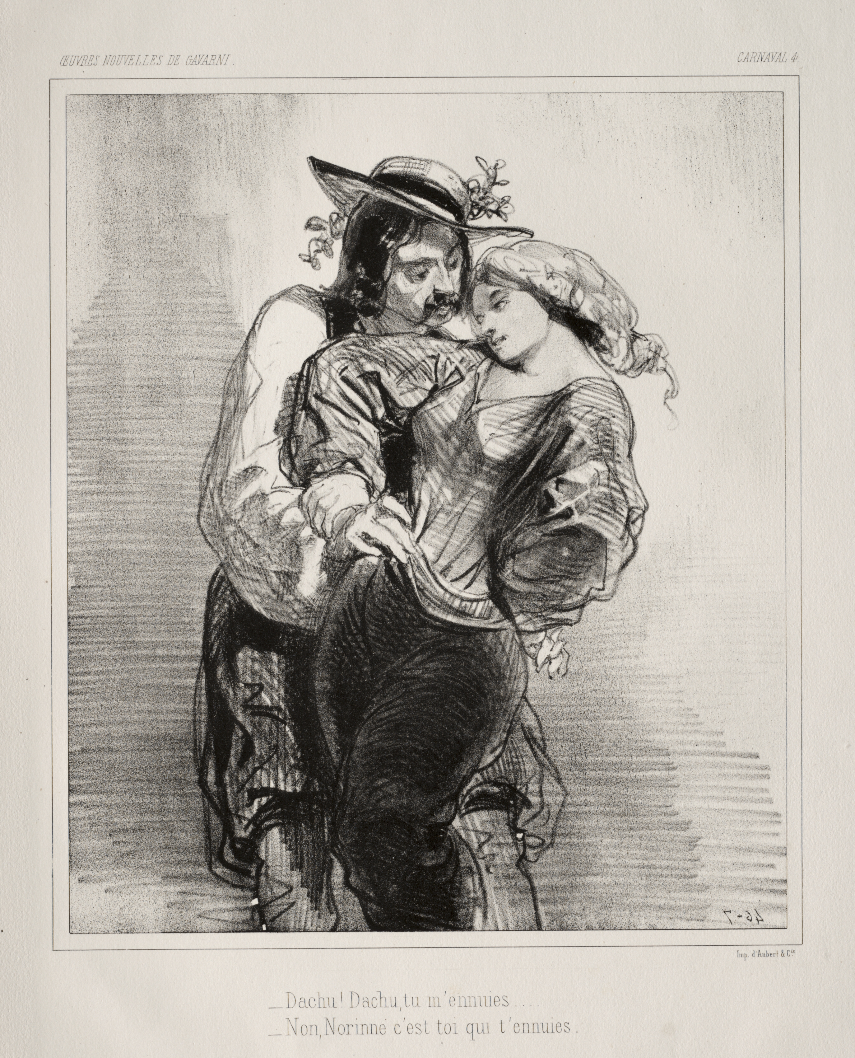 Black and white drawing of a man and woman. The man is on the left. He has medium length dark hair and a mustache. He is wearing a hat with a wide brim and a feather tucked into it on the right. He has on a white shirt with billowy sleeves, a vest, and dark pants. The woman is on the right. She has medium length curly light colored hair with a hat on top. She is wearing a dress. The man is holding her up against him. Her left arm is around his neck. Her right arm is down. The man has his left arm around her waist. His right hand is on her right hand. There are two lines of French writing at the bottom. The background is shaded.