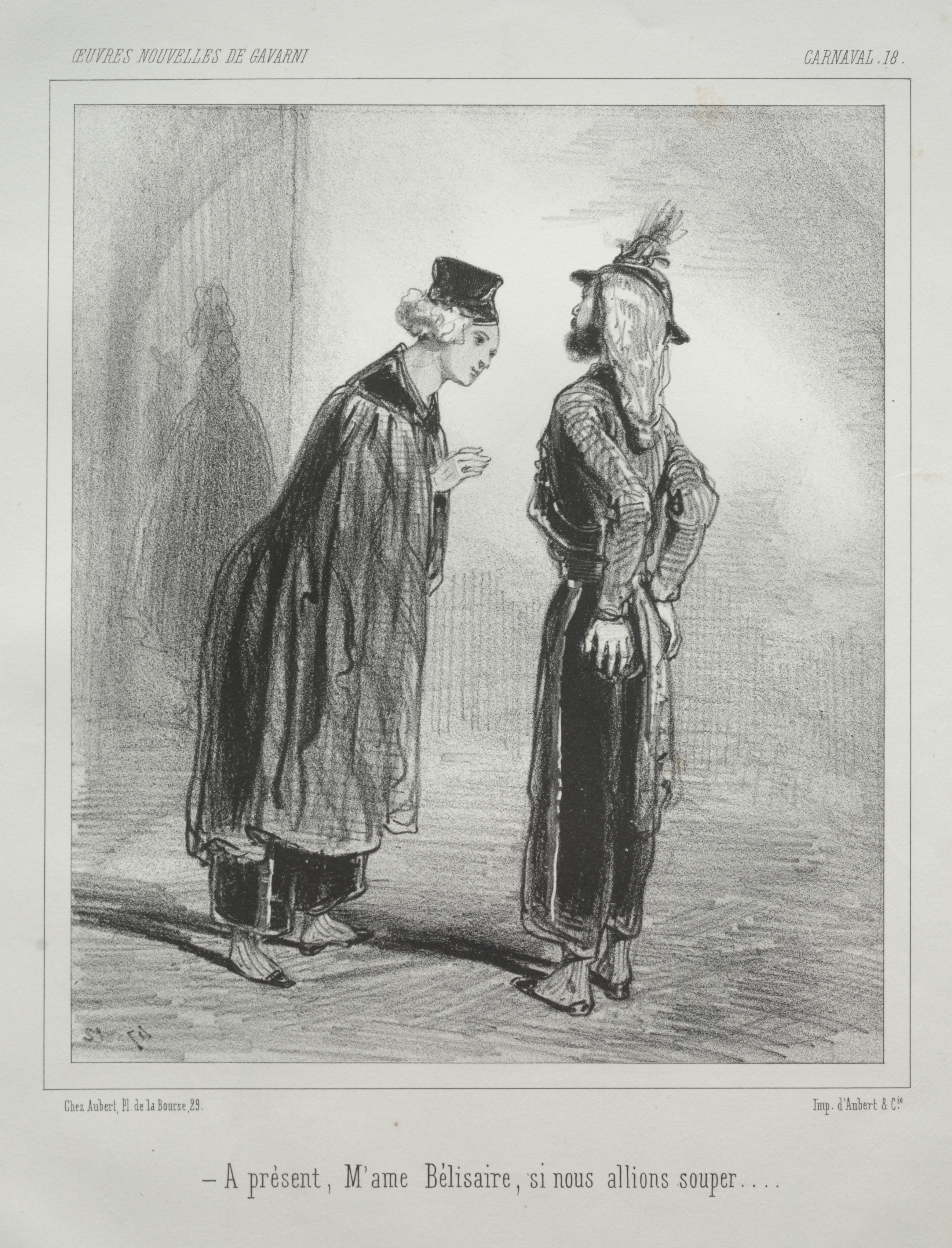 Black and white drawing of two people wearing costumes. The person on the left is wearing a long dark robe with a dark hat. The person on the right is wearing a striped jacket and a hat with a feather. Text at the bottom of the image reads, "- A present, M'ame Belisaire, si nous allions souper....." The image is titled "Carnaval" and is by Paul Gavarni.