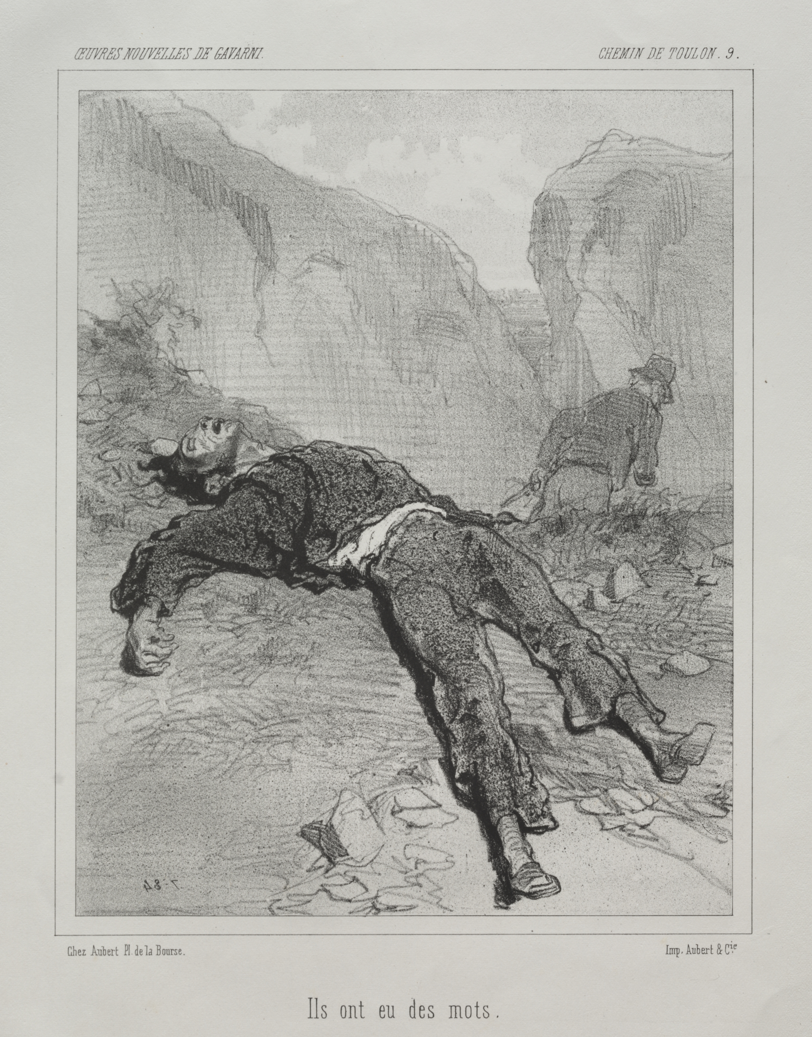 Black and white drawing of a man lying on the ground on his back with one arm bent at the elbow, the other straight down, wearing a hat with a dark suit jacket and light shirt; on a road with mountains behind him. A man sits on a rock in the background. Text at the top reads "OEuvres nouvelles de Gavarni" on the left and "Chemin de Toulon. 9." on the right. Text at the bottom reads "Ils ont eu des mots".