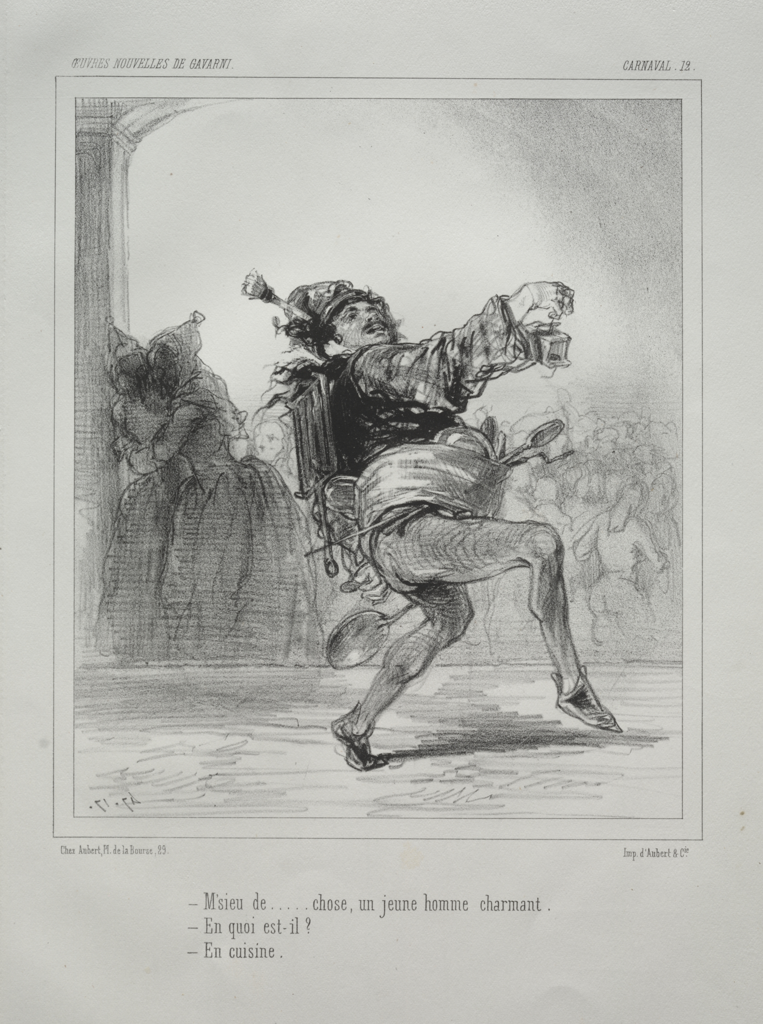 Black and white drawing of a man in a dancing position with his right leg bent behind him and his left foot flat on the floor. He wears a hat with a feather tucked into it, a vest, loose-fitting pants. His left arm is extended outward holding a mask. A semi-circular line of onlookers on right; woman and man standing on left. Column in background on left. Text at bottom of drawing reads: - Msieu de....chose, un jeune homme charmant. - En quoi est-il? - En cuisine. Small text at top-left reads "oeuvres nouvelles de gavarni", top-right reads "Carnaval 19."