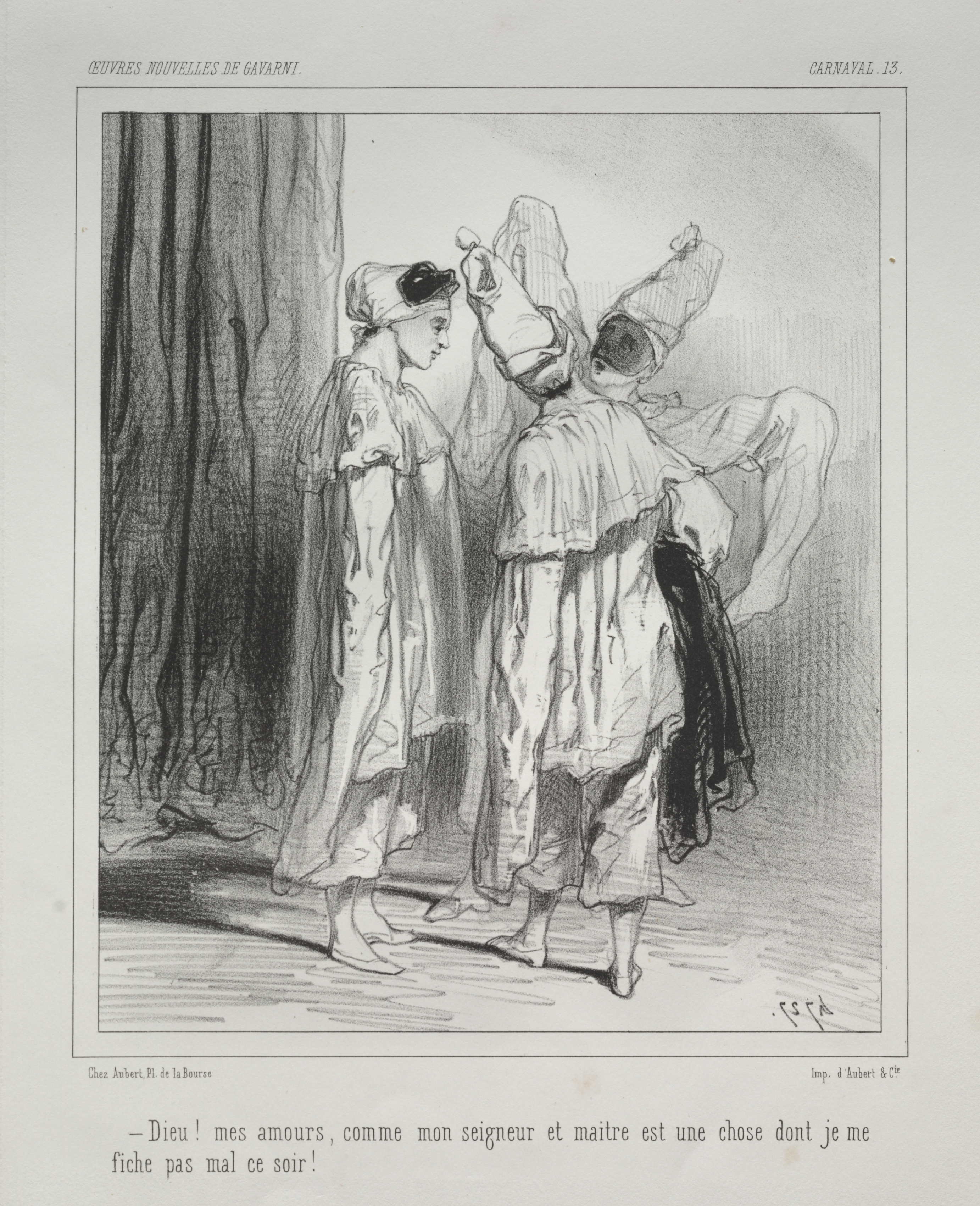 Black and white drawing of a scene titled "Carnaval" by Paul Gavarni. Two people wearing white outfits and masks look to a third person on the ground. The person on the ground wears an off-white outfit with a hat and white socks. The ground is wood and there is a curtain on the left. The image contains French text at the top and bottom. The two standing people are looking down at the person on the ground, who appears to have fallen over backwards. The standing people wear loose-fitting white clothing with billowy sleeves. The person on the right has a black cape or coat hanging from their arm. The background is shaded with darker tones behind the curtain and lighter tones elsewhere. The drawing style is detailed with shading and texture. The overall composition shows a moment of interaction between the three figures.