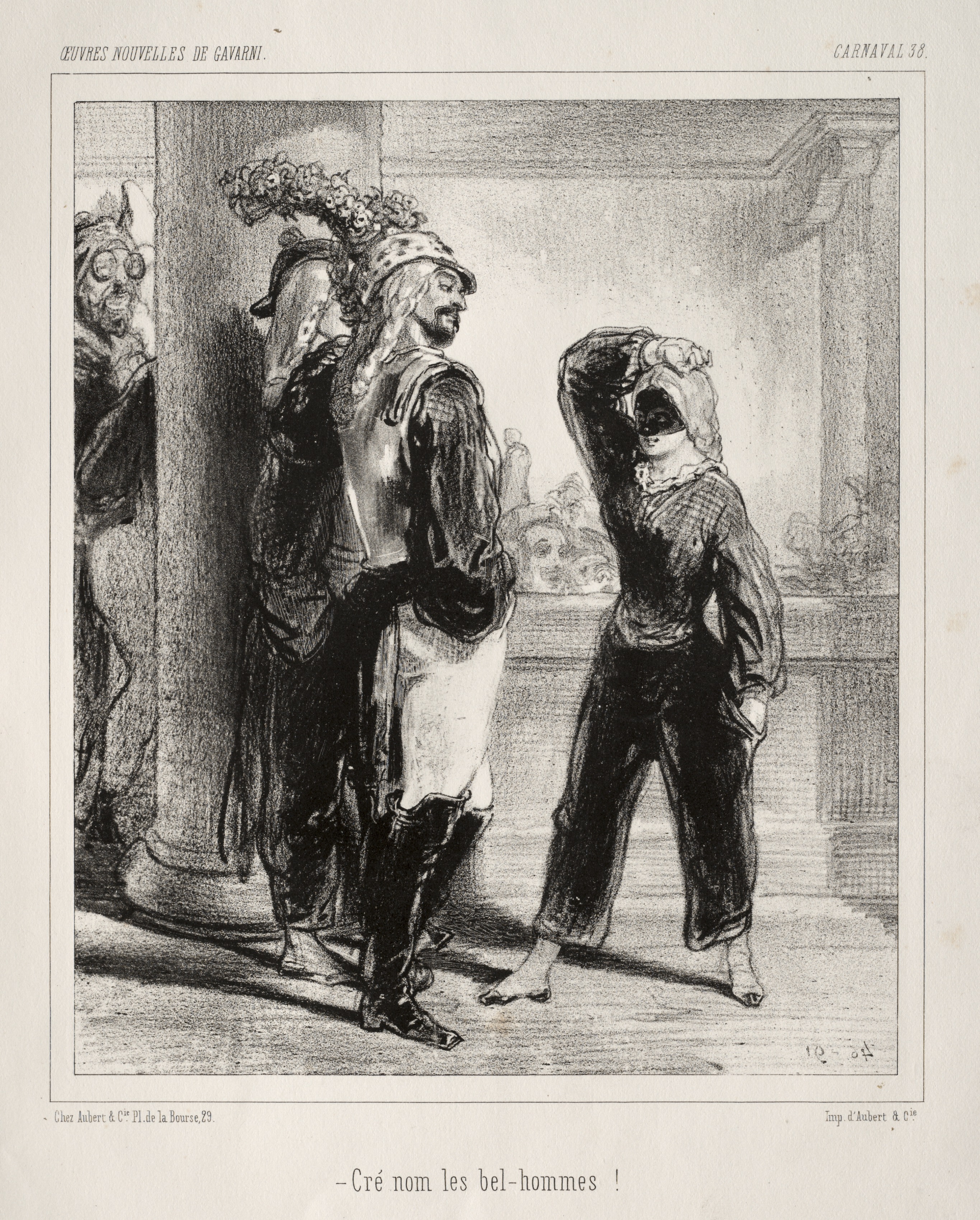 Black and white drawing of a scene titled "Carnaval" by Paul Gavarni. Three people wearing masquerade costumes and masks are standing inside a room with columns and a mantle. The person on the left has a grotesque mask with a large nose and glasses and wears a tall hat; they are standing behind a column with their right hand on the column. The central figure, a man, wears a checkered hat decorated with flowers and a white apron. The person on the right, a woman, bends forward at the waist with her hands on the back of her head and looks up. The woman on the right and the man in the middle are barefoot. The background shows a mantel and some architectural features. The image includes the text "-Cré nom les bel-hommes !" at the bottom.