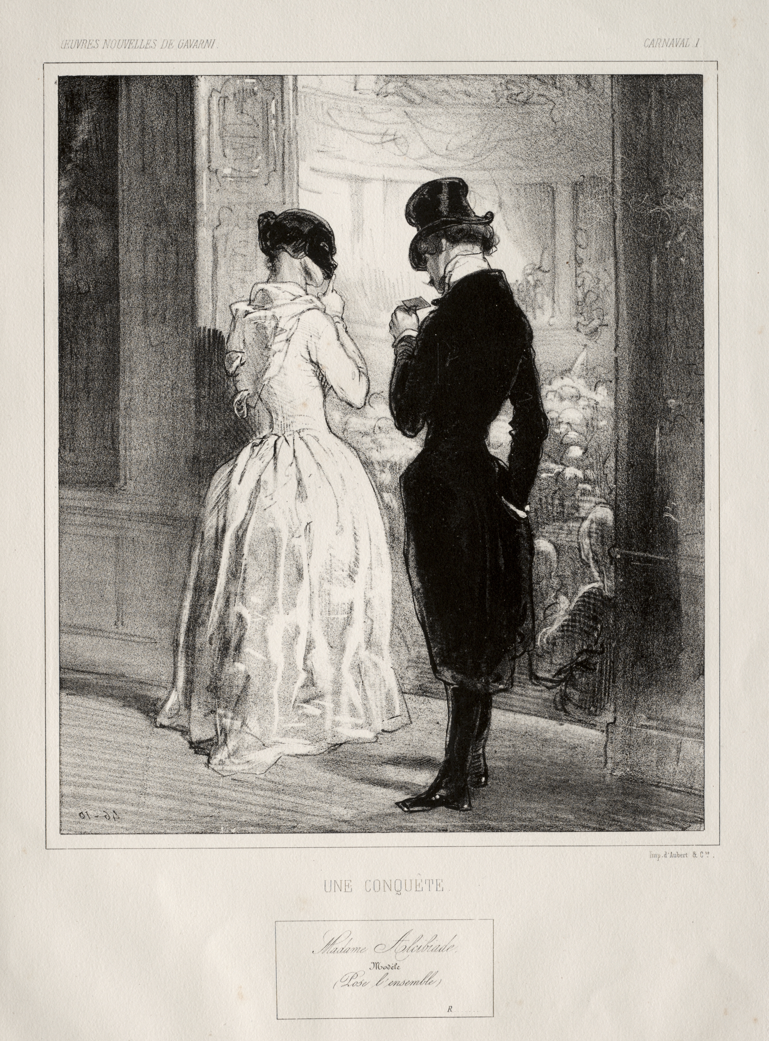 Black and white drawing of a man and woman. The woman wears a white dress with a puffy collar and sleeves. Her hair is styled up. She faces the right. The man, on the left, wears a top hat, black tailcoat, and black boots. He faces the right and holds a cigar. They stand indoors with a brightly lit area behind them. A balcony railing and people are visible outside. The scene is titled "Carnaval" by Paul Gavarni.