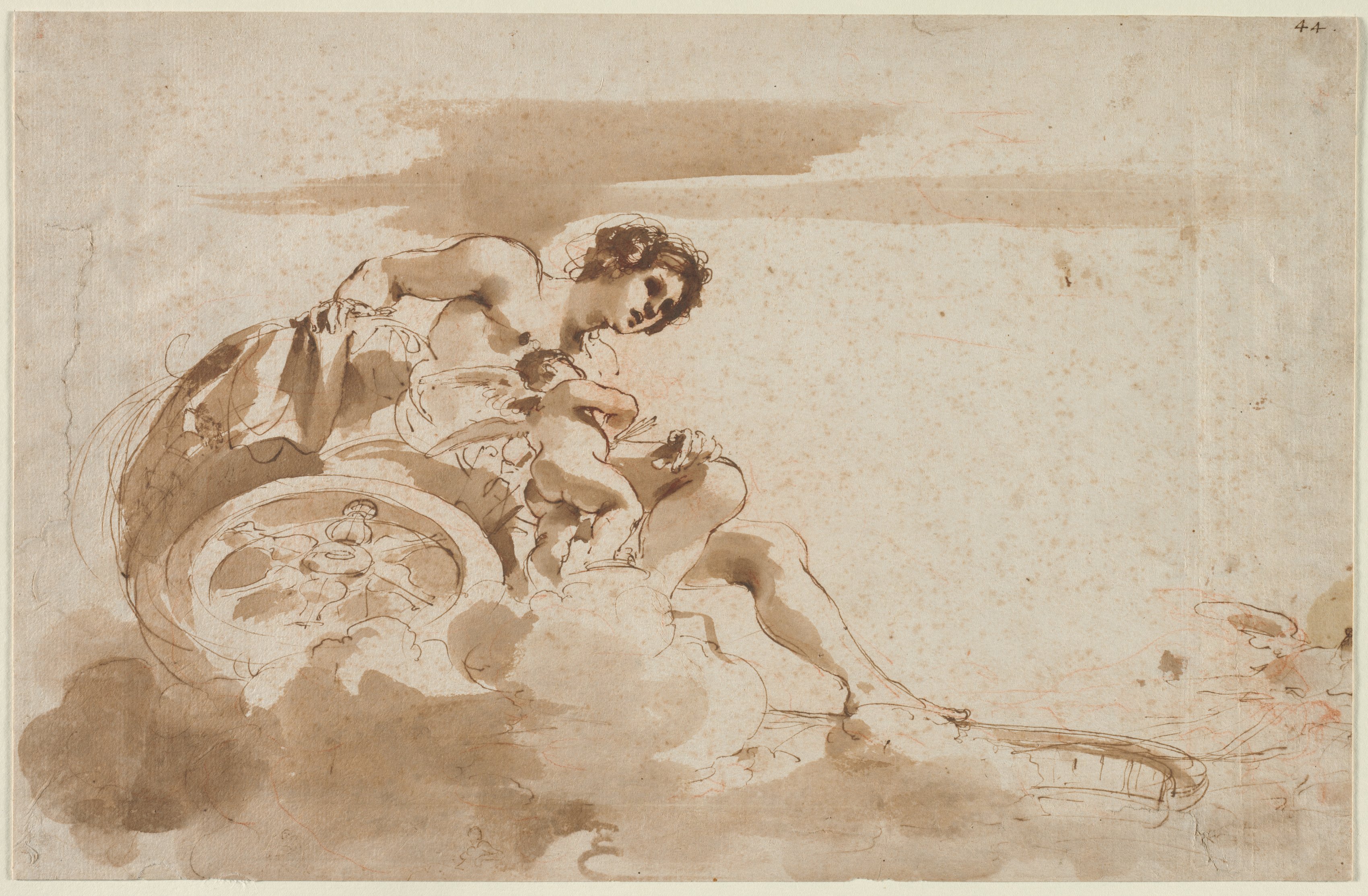 Venus and Cupid in a Chariot by Guercino. A sepia-toned sketch of a chariot drawn with one wheel visible and one obscured. A woman with curly dark hair wearing a short flowing dress holds a small child with curly dark hair. The pair are sitting sideways on the chariot, with the woman’s back to the left, looking down at the child who faces right. The child holds an object in the right hand. The chariot appears to be on top of clouds.