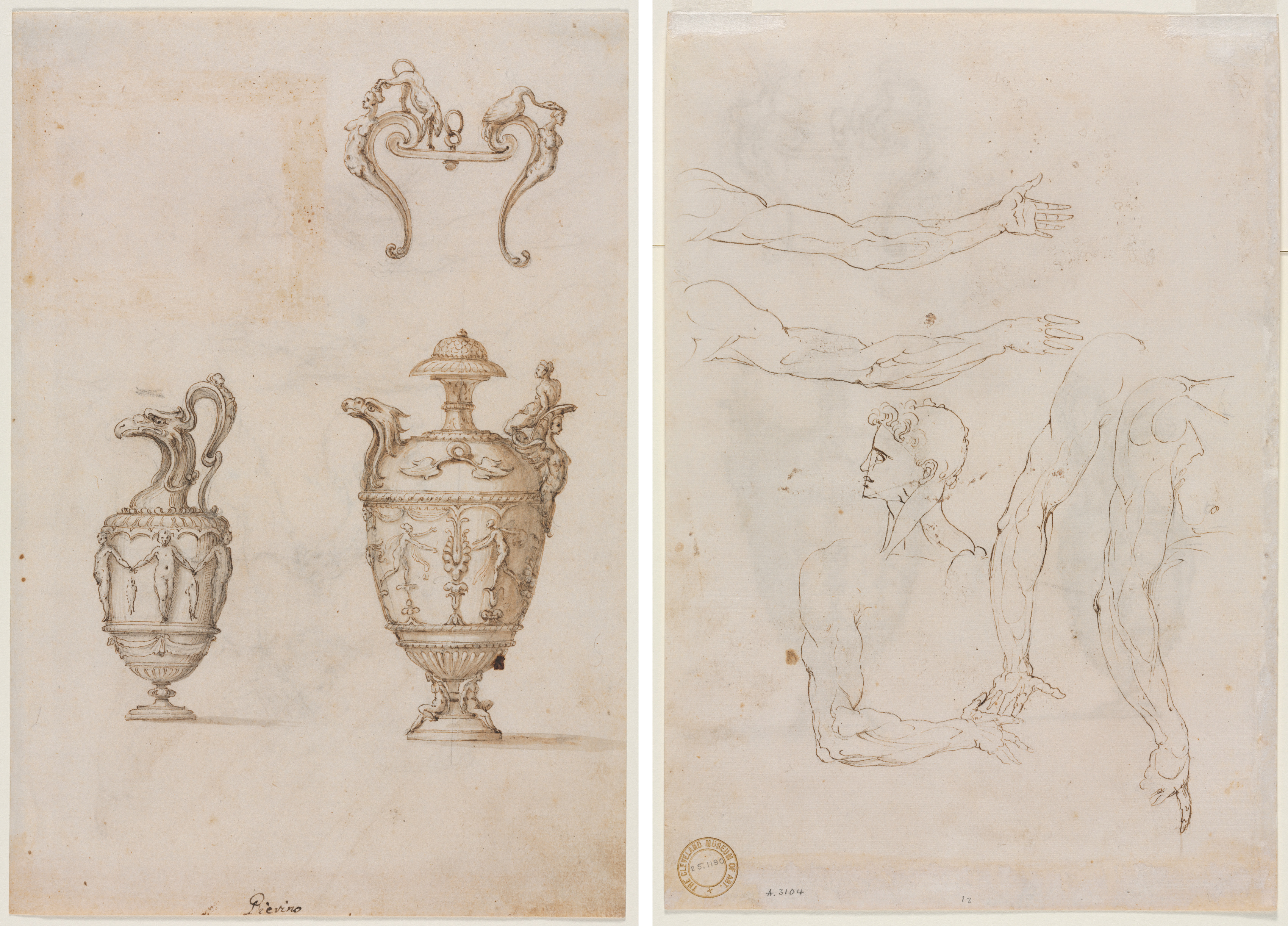 Design for Two Vases and an Ornament (recto); Sketches of Five Arms and a Head (verso)