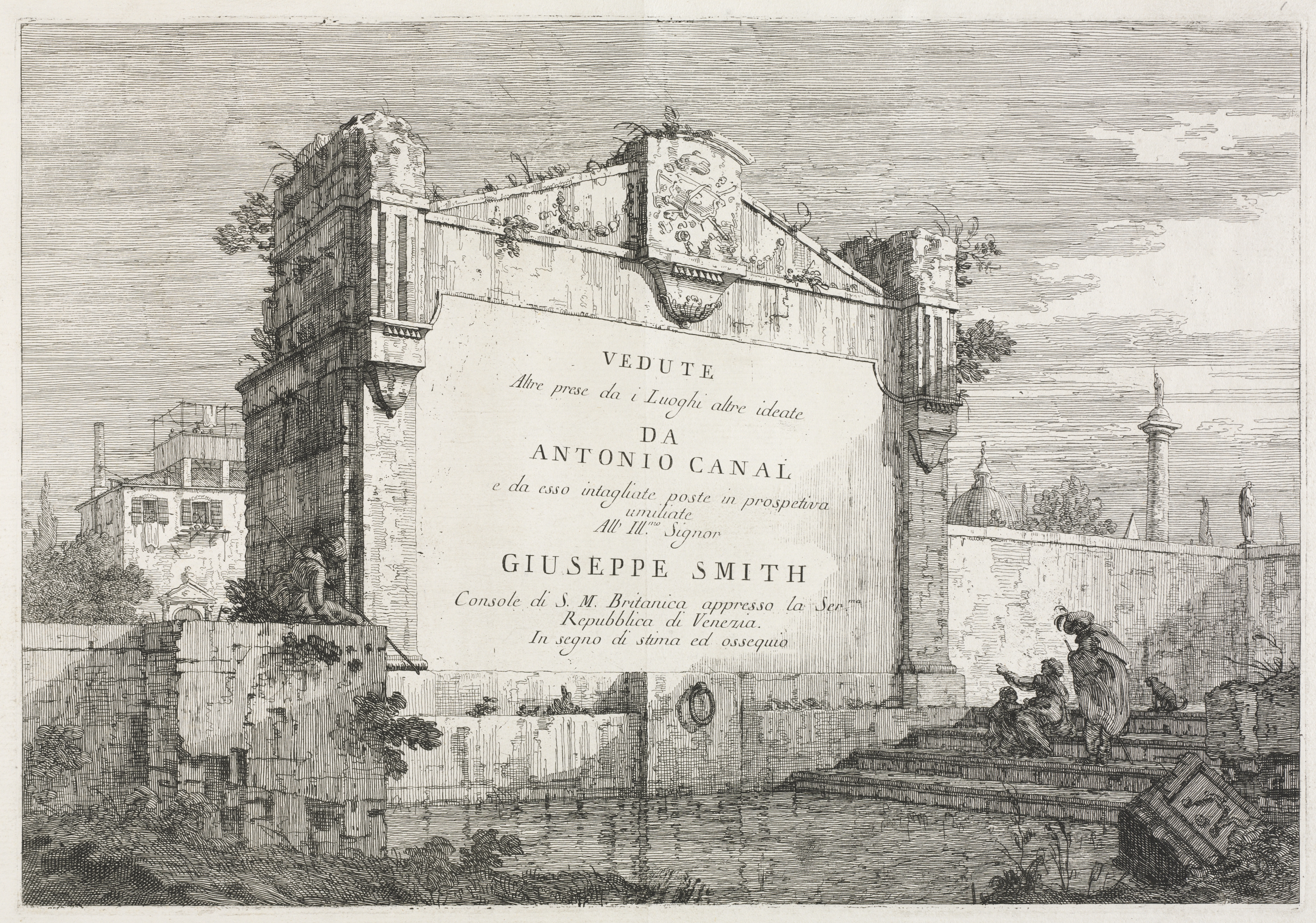 The image shows an old, stone wall with a large sign on it. The wall is made of stone and has a decorative top with plants growing out of it. There are two people sitting on steps to the right of the wall. The sign on the wall is large and rectangular, with text written in Italian. The text is divided into several lines and reads: "VEDUTE Altre prese da i Luoghi altre ideate DA ANTONIO CANAL e da esso intagliate poste in prospettiva. umiliate All' Ill. Signor GIUSEPPE SMITH Console di S. M. Britannica appresso la Ser Repubblica di Venezia. In segno di stima ed ossequio". The background of the image shows a cloudy sky, trees, and buildings. A small tower with a statue on top is visible on the right side. The overall atmosphere suggests an old, historical scene.
