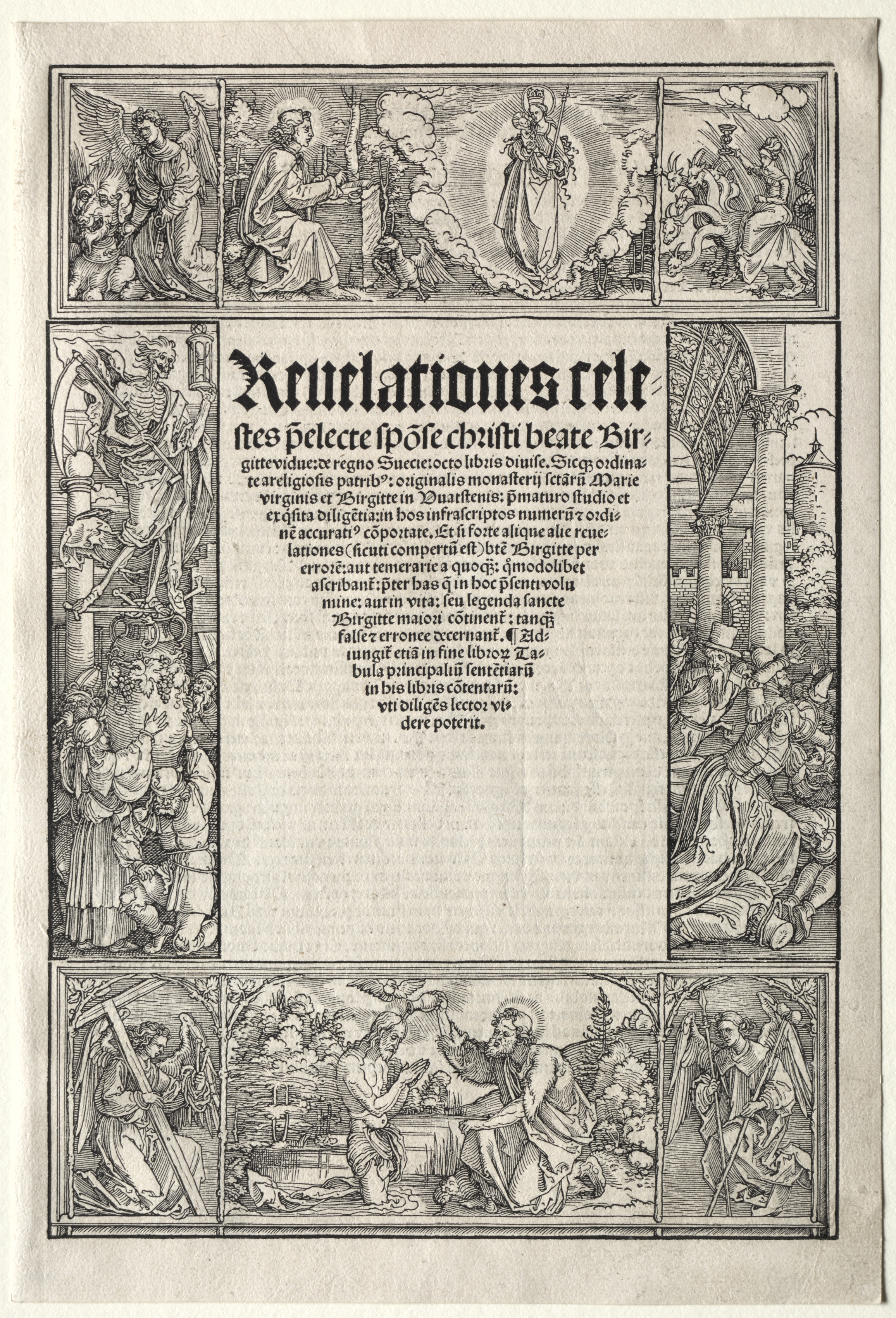 Black and white illustration on off-white background. Title in bold black calligraphy font at top center. Large block of black text below title. Border of nine panels with illustrations in black and white. Top center panel: figure in flowing robe standing on wavy lines flanked by two panels with figures on clouds. Left side panel: figure playing a lute. Right side panel: figure kneeling in archway. Bottom center panel: four figures around a table outdoors. Bottom left panel: figure kneeling holding large cross. Bottom right panel: figure with spear standing over a lion and a dog. Top left panel: two figures with angel and lion. Top right panel: two figures on clouds.