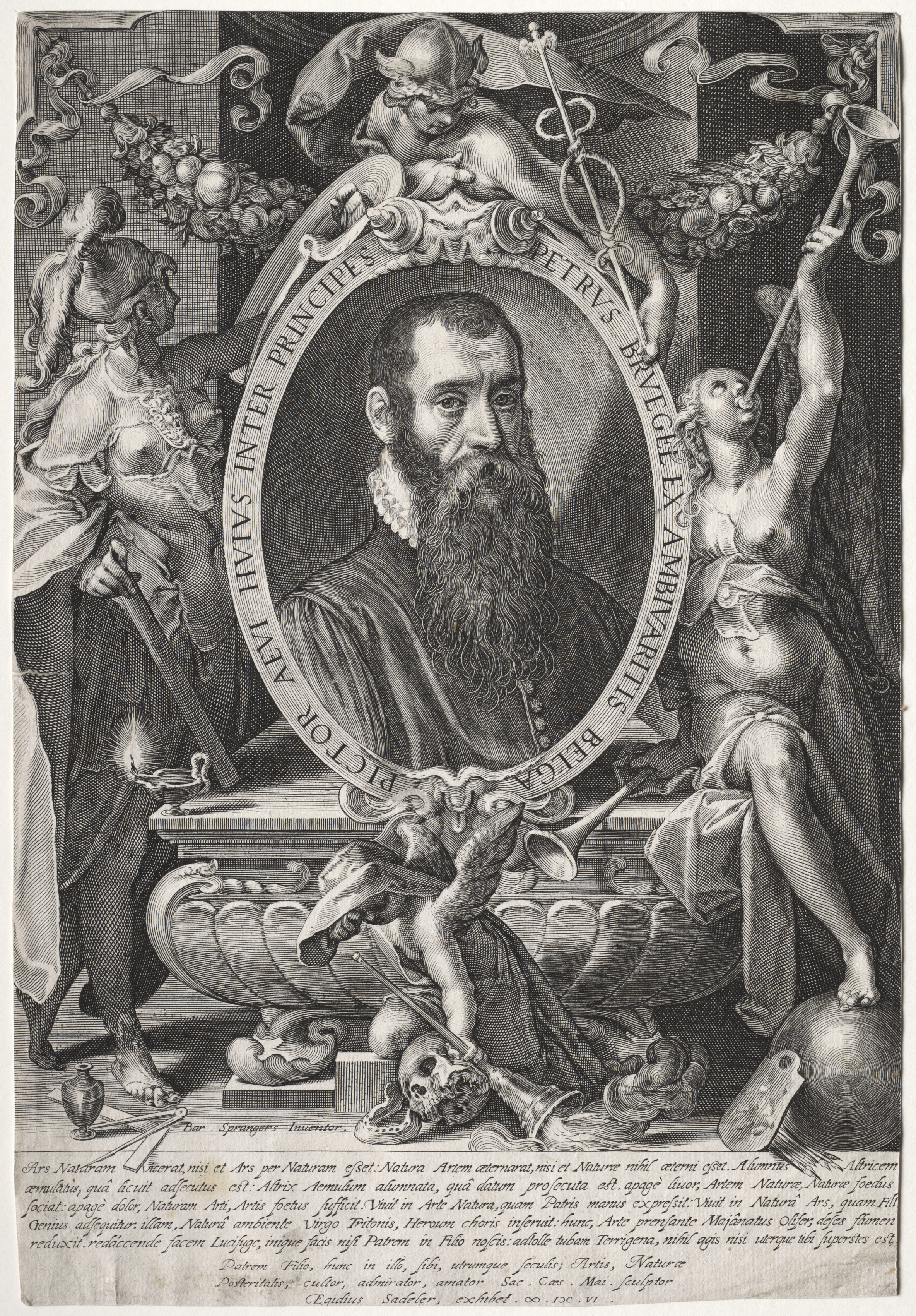 Black and white image of an engraving of a man with short dark hair and a long beard wearing a dark robe. The man's head and shoulders are centered in an oval frame with writing on it. The oval frame is surrounded by decorations and two figures, one on each side. The figure on the left is wearing a dress and holding scepter-like object. The figure on the right is topless with a cloth wrapped around her lower body and is holding a horn to her lips. The figures appear to be standing on a decorated table with various objects on and below it, including an animal figure, a skull, and a vase. There is text at the bottom of the image. The style is detailed and ornate, suggesting it may be a historical or artistic representation. The overall appearance suggests this could be a portrait of Peter Bruegel by Aegidius Sadeler.