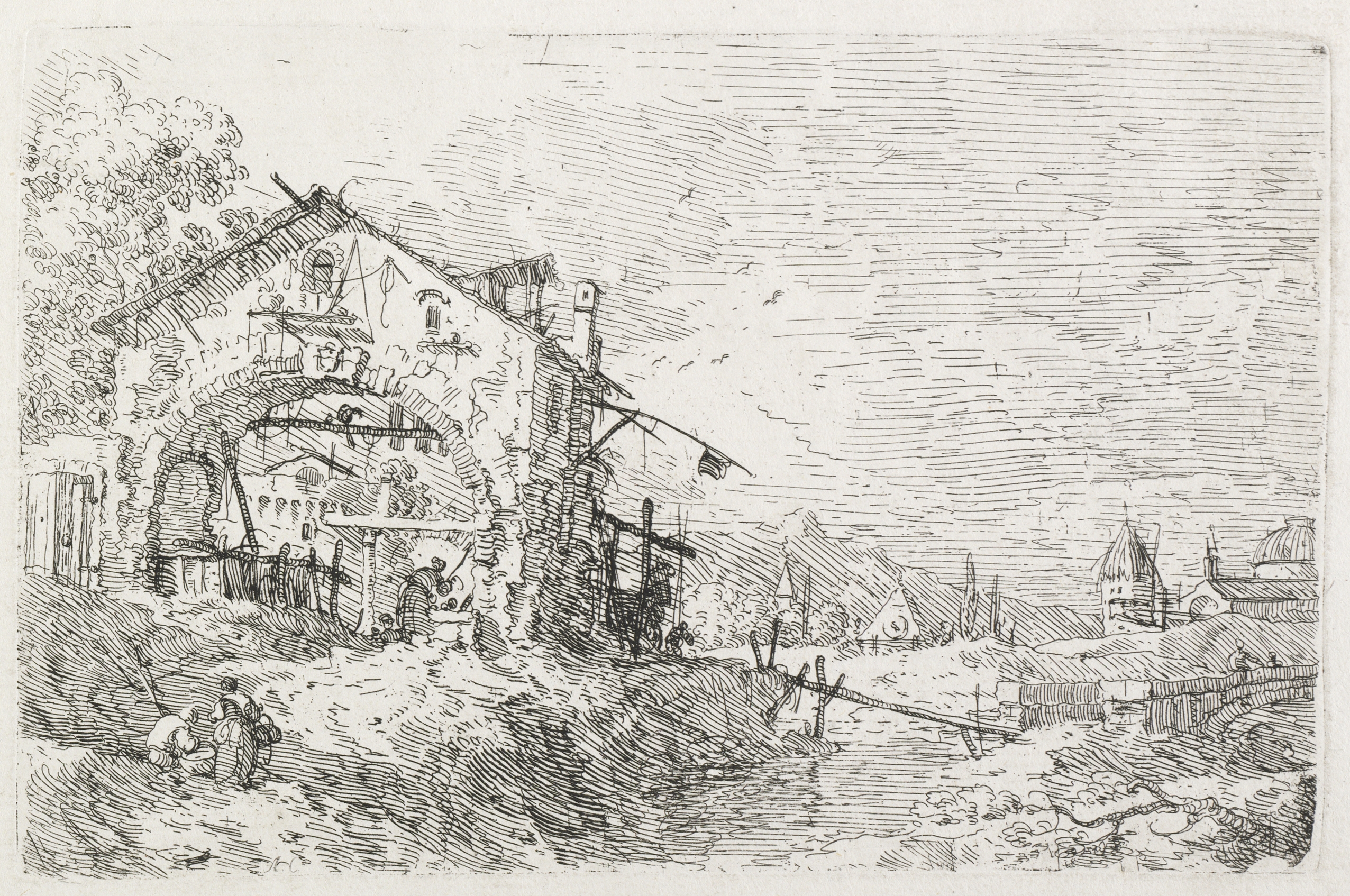 The image depicts a black and white drawing of a landscape with a large building on the left side. The building has a slanted roof and an archway on the front. There are people standing outside the building. In the background, there are several other buildings, including one with a dome-shaped roof. The sky is filled with lines, suggesting wind or clouds. The image has a border around it, and the entire scene is rendered in dark lines on a light background. The drawing appears to be an old etching or engraving. The scene shows a woman drawing water under an arch. The artwork is by Antonio Canaletto. The title of the artwork is Views.