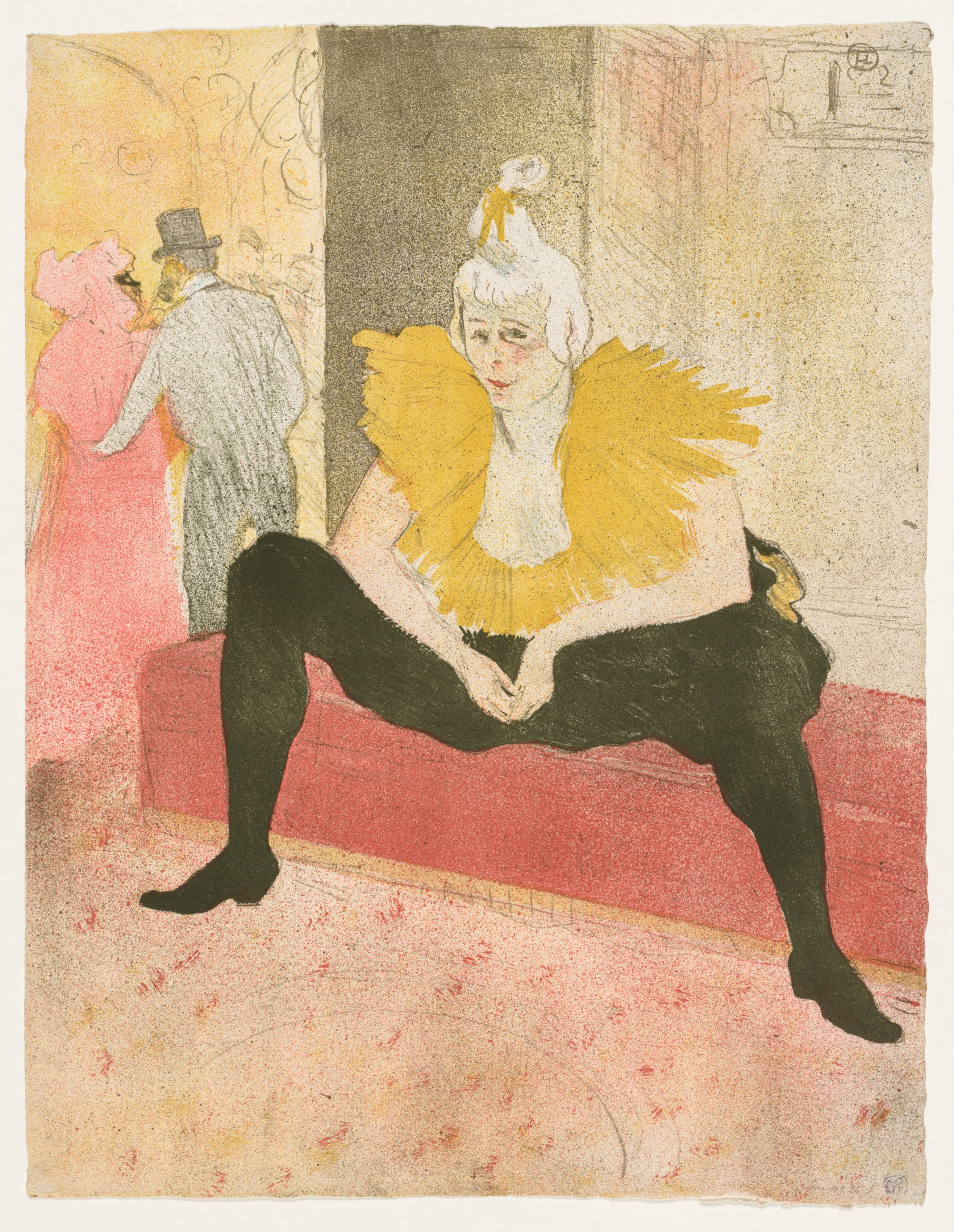 The seated clown is a woman with white hair styled in a tall pompadour, adorned with a yellow ribbon. She wears a vibrant yellow feathered collar or ruff around her neck, a black leotard or bodysuit, and black tights or stockings. Her legs are spread apart, with her feet positioned slightly outward; her right foot points inward. Her hands are clasped together in her lap. The clown's face displays pink cheeks and a neutral expression. She sits on a red bench or platform. In the background, a man and woman are visible on the left. The man wears a gray top hat, a light-colored jacket, and dark pants. The woman has a pink dress and a pink hat. The background features a mix of yellow, pink, and gray tones. The floor has a pink and beige pattern. The wall behind the clown includes a gray pillar and a beige section with some indistinct writing or drawing.