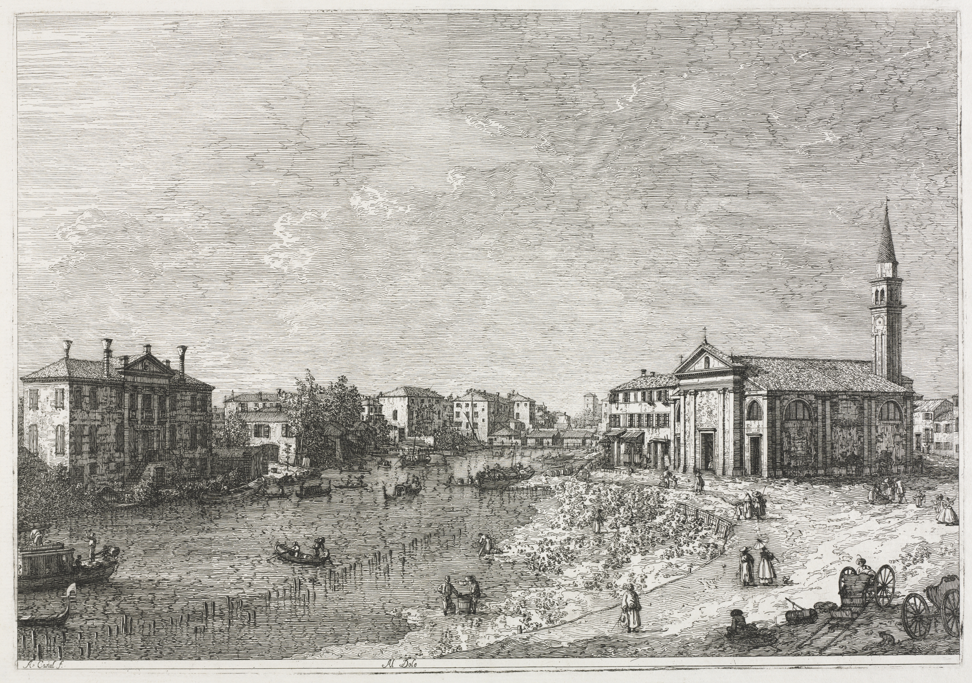 Black and white etching of a town on a river. The town has a church with a tall thin steeple on the right. A large building with many chimneys is on the left across from the church. Many buildings line the horizon. People and boats are on the river and along the shore. A horse-drawn cart is on the shore in the foreground. The sky is cloudy.