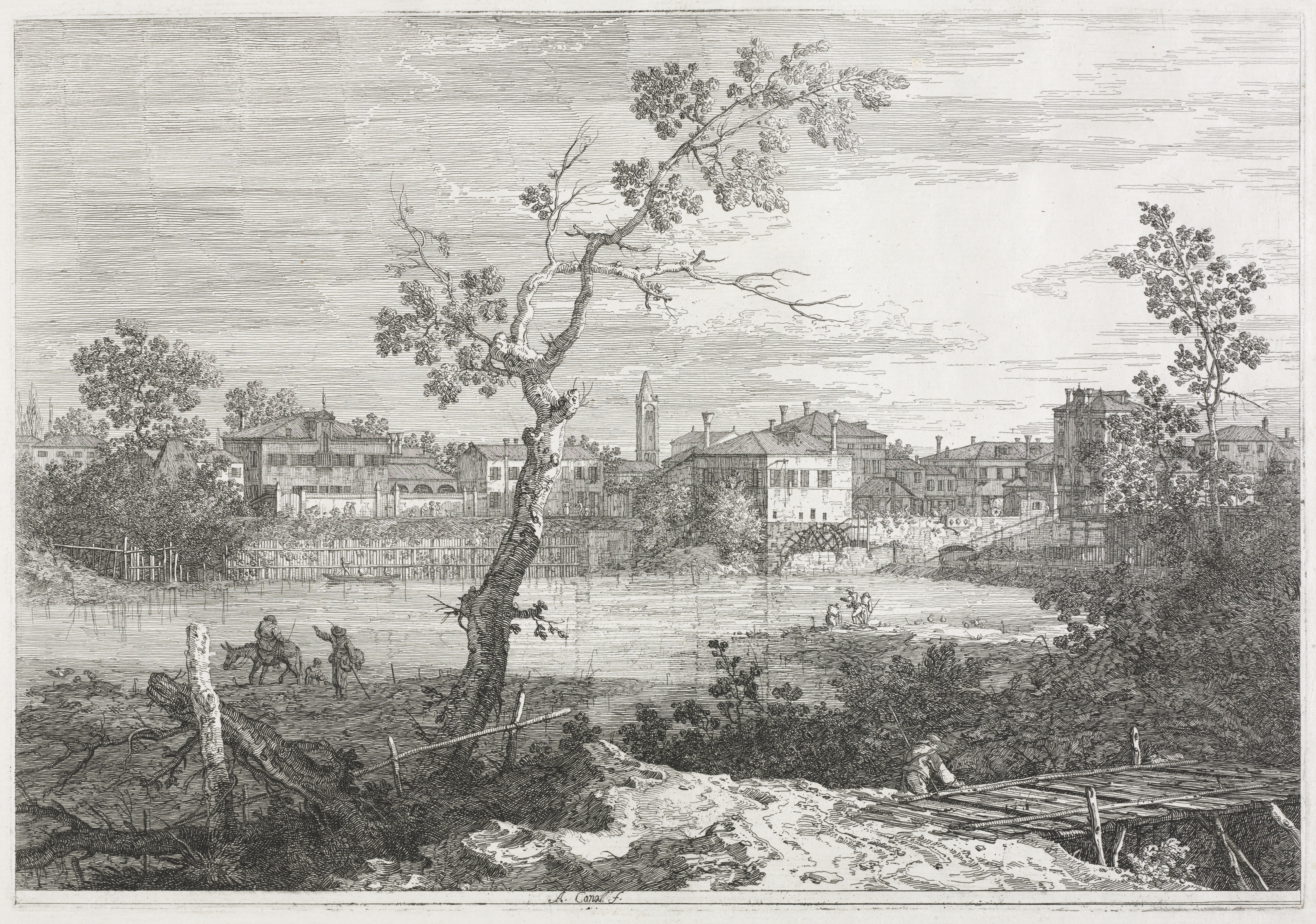 View of Burano, a Town on an Island in the Venetian Lagoon by Antonio Canaletto. The image features a black and white drawing of a town on an island. There is a body of water with a stone bridge on the right side in the background. The town has numerous buildings and a tall tower. Trees and greenery are on both sides of the river. The foreground includes people on a donkey and horse on the left and a person on a raft on the right. In the very foreground, there is a large tree on the left and a pile of logs on the right. The drawing has very detailed lines throughout. The sky has many clouds.