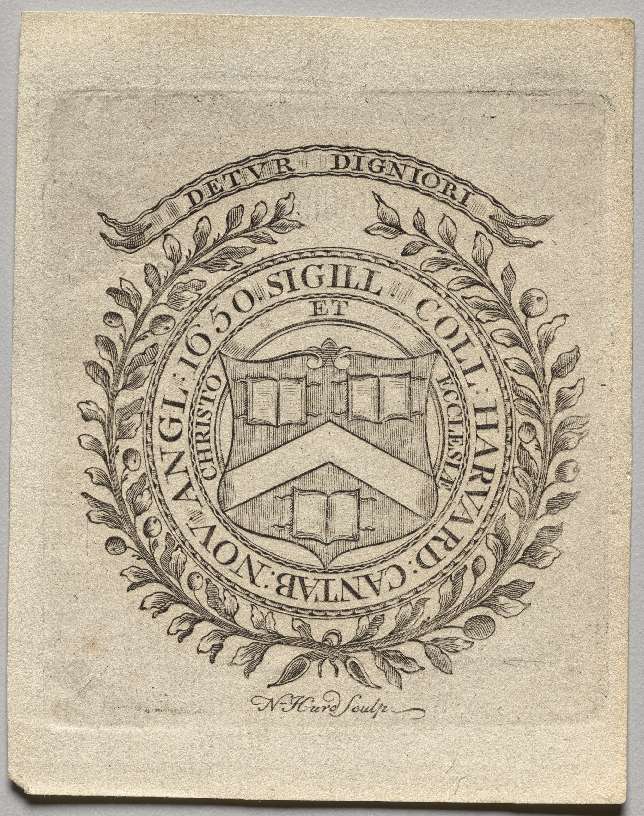 Beige-colored bookplate with a rectangular shape and slightly darker edges. A circular seal in the center features three books stacked with a chevron over them. The circle is surrounded by a wreath of leaves and foliage, with a ribbon banner above with text. The circular seal has text around its edge. The text on the banner reads "DETVR DIGNIORI". The text on the circular seal reads "SIGILL COLL HARVARD ANGL 1650 ET CHRISTO". The bottom of the bookplate features a signature. The overall design is in black.